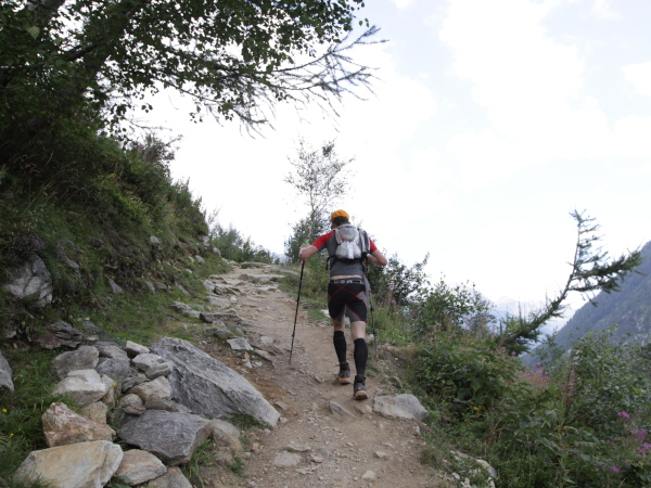 Nach knapp zwei gemütlichen Kilometern geht es bergauf. Wir haben also unseren Plan übererfüllt, haben den Grand Col Ferret hinter uns und den ersten Anstieg danach vor uns. Wir werden auch das nächste Ziel, Champex (km 45, 1477 m), erreichen, bevor es richtig dunkel wird. Wir sind noch immer in der Schweiz, im Wallis, aber es wird französisch gesprochen.