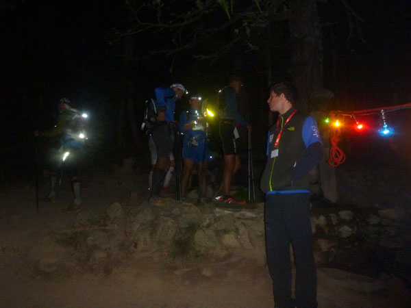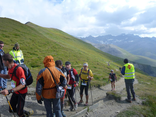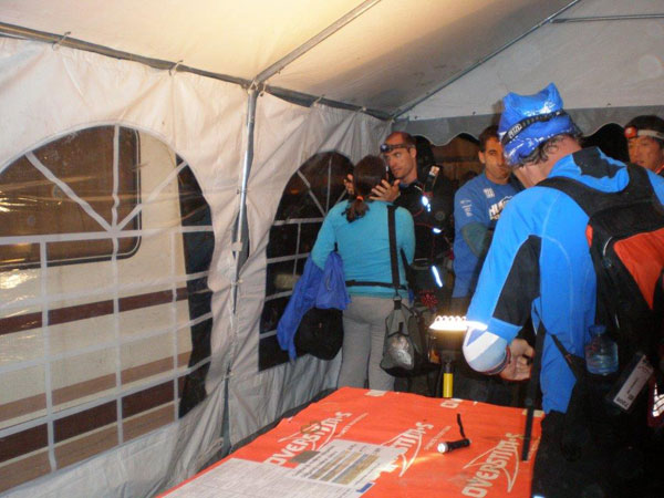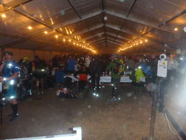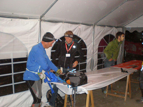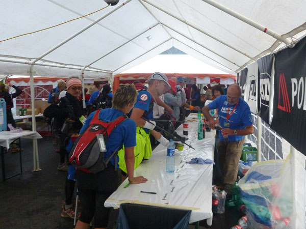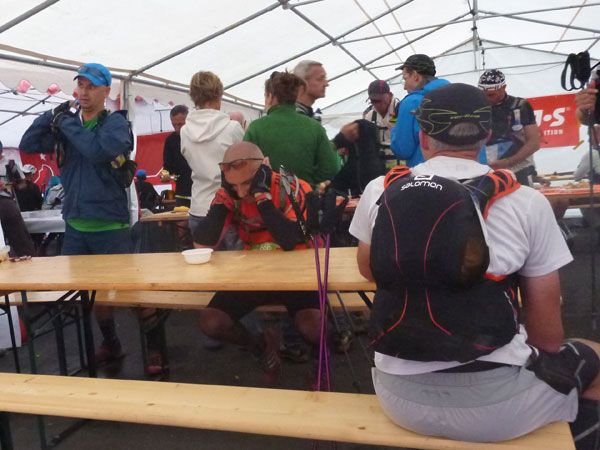 Neben dem Eingang ein Stand für die Ausrüstungskontrolle. Ich habe Glück und bleibe davon verschont. Daneben ein Tisch für den Busrücktransport …falls man Aussteigen will. Ich bin völlig down, sehr verlockend, aber keine Alternative. Ich gebe mich nicht geschlagen. Habe nach meiner günstigsten Rechnung ein Zeitpolster von 1:30 Stunden und die werde ich ausnützen. Die Zeit-Barrieren haben aber auch immer neben der Laufzeit eine Uhrzeitgrenze, in der die um 15 Minuten verspätete Startzeit nicht eingerechnet ist. Dazu kommen noch die 10 Minuten Zugabe anhand der kurzfristigen Streckenverlängerung. Auch hier sind die ausgehängten Kilometerangaben noch nicht auf dem aktuellsten Stand. Dadurch bin ich immer etwas verunsichert ob der genauen Durchgangszeiten. Nach der ungünstigsten Rechnung ist es nur eine gute Stunde.