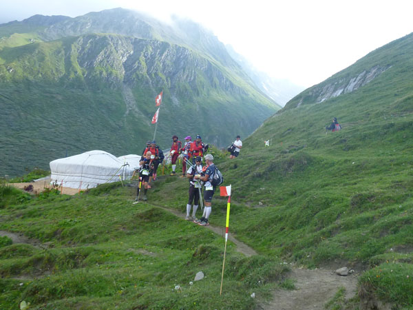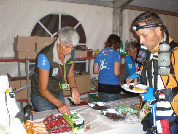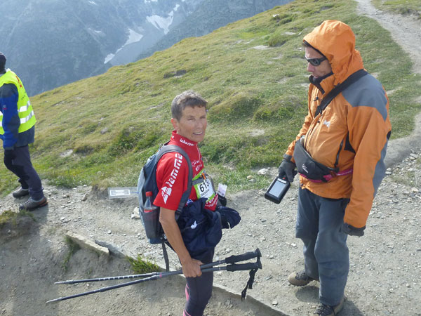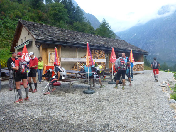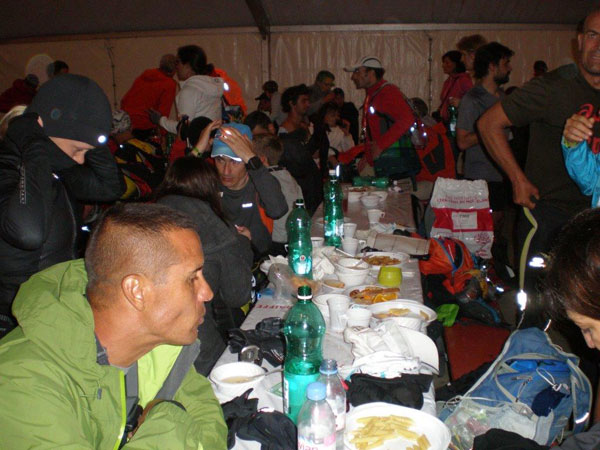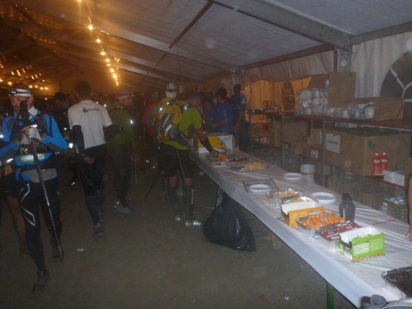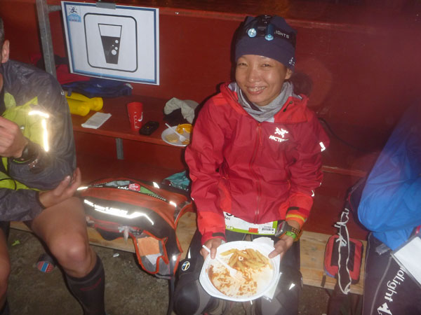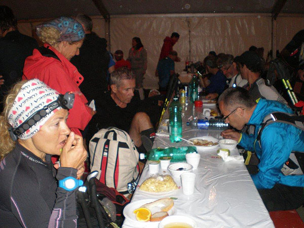 Kurz vor 19 Uhr treffe ich an der großen Versorgungsstation in La Fouly ein. Mir bleiben zum Zeitlimit etwa 45 Minuten. Ich bin die 9 km, soweit es ging, durchgelaufen, bin jetzt völlig groggy, habe keinen rechten Appetit und würge aber etwas hinunter. Frage mich aber insgeheim: Wie soll ich bloß die verbleibenden fast 60 km noch überstehen? Gerne erinnere ich bei körperlichen K.O.-Phasen immer an den Ausspruch eines bekannten Ultraläufers: „Es wird nicht immer noch schlimmer, sondern irgendwann geht es auch wieder aufwärts.“ Aber wo soll die Kraft heute herkommen, wo ich mich doch schon von Anfang an nicht so besonders fühle?
