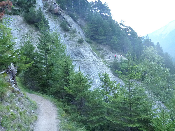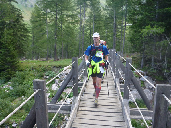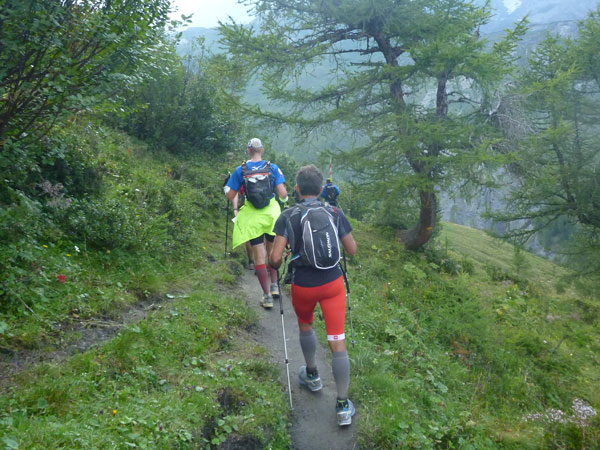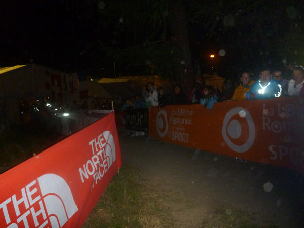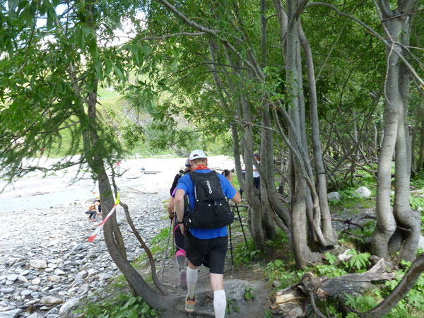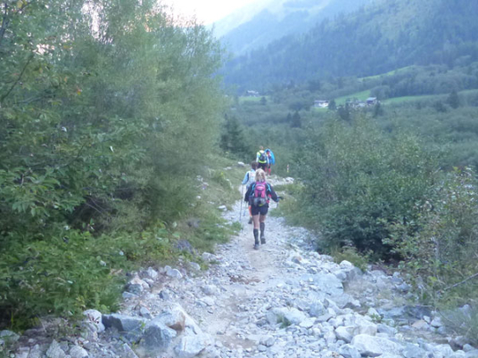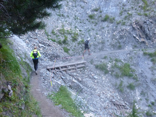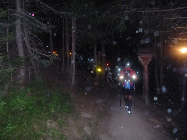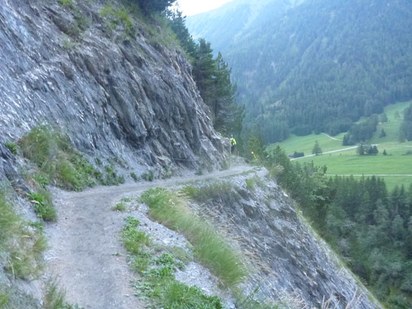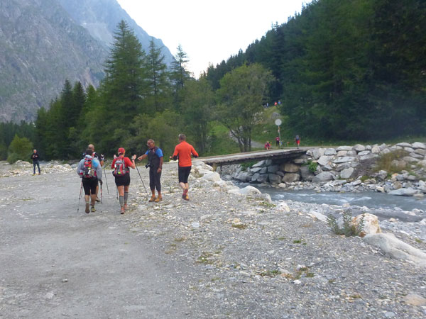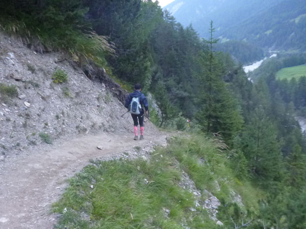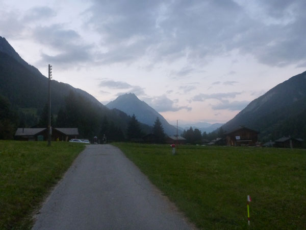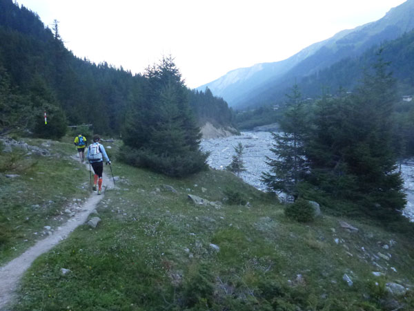 Mit mäßigem Gefälle geht es weiter, durch den Wald und entlang des Flußbettes der Dranse de Ferret. Steinig und unangenehm ist der Weg, obwohl er sehr flach ist. Ich bin noch steif und kaputt, komme nicht so richtig in die Gänge. Es wird langsam dämmrig. Kurze Aufstiege sind jetzt auch dabei. Wir laufen oberhalb des Flusses an der Bergflanke entlang. Es läuft wieder besser. Die Strecke ist schön am Hang und der Trail auch wieder angenehmer zu laufen. Ein letztes steiles Gefälle und ich erreiche eine Straße. Eine große Gruppe Schlachtenbummler feuert mich an. Es ist schon verdammt dunkel. Ich habe auch noch meine Sonnenbrille auf, die muss gewechselt werden und die Stirnlampe muss raus.