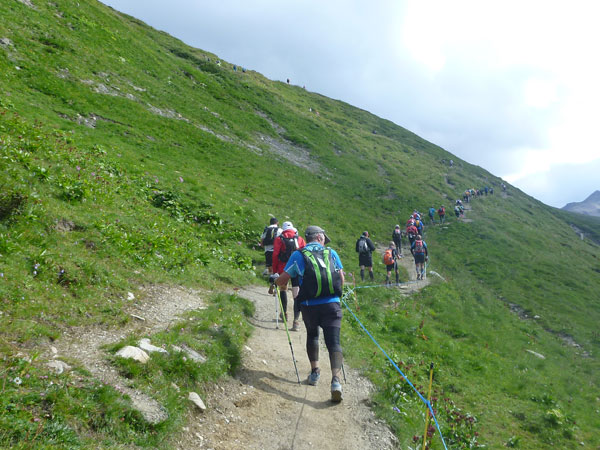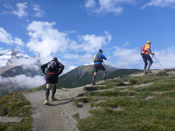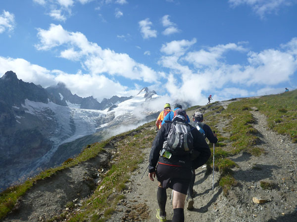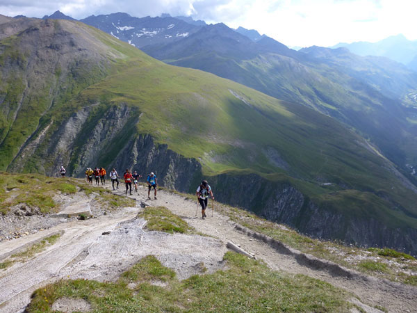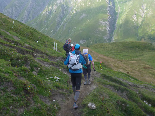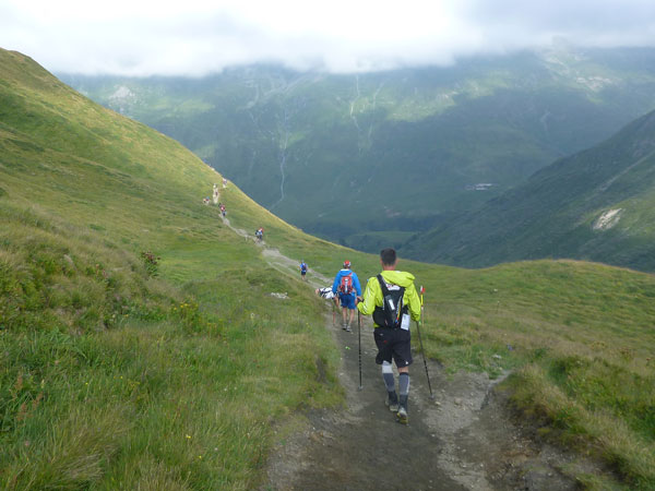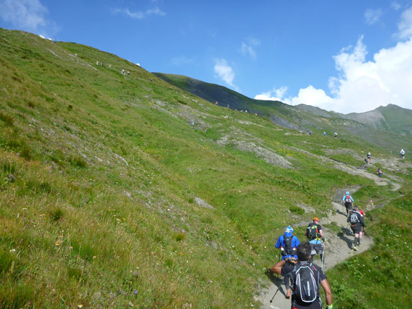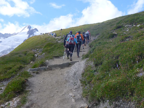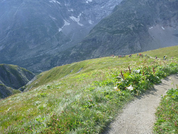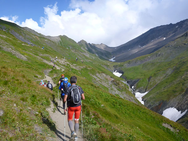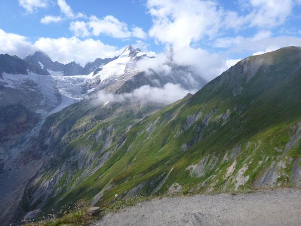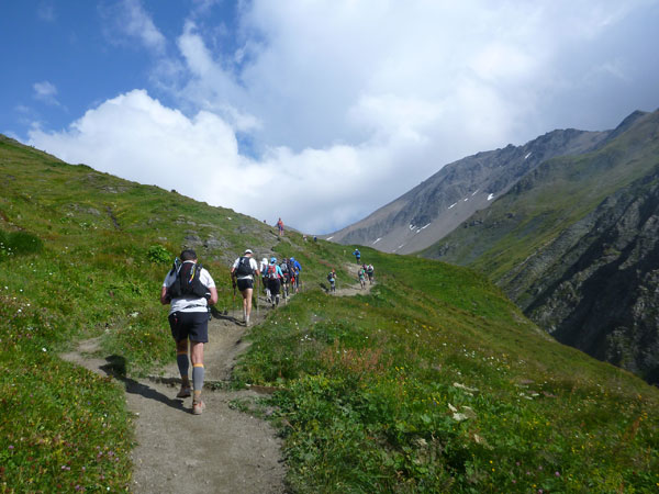 Durchgängig bis zu seinem höchsten Punkt auf 2.537 m ist der Grand Col Ferret grasbewachsen ohne sonstigen Bewuchs, er wird lediglich von kleineren Felsbändern durchzogen. So stellen sich uns keine unangenehmen Hindernisse in den Weg. Aber der Pfad hinauf ist steil und nur langsam und mühsam winden wir uns auf Serpentinen nach oben. Entschädigt werden wir aber mit einer grandiosen Landschaft. Mir gefällt besonders der Kontrast der grünen Wiesenflächen zum gegenüberliegenden steinigen Hochgebirge mit seinen schneebedeckten Gipfeln. Ein Gletscher präsentiert uns aus nächster Nähe seine weit herunterfließende weiß-graue Gletscherzunge. Ein Blick zurück öffnet uns das gesamte Val de Ferret und dazu strahlt ein weiß-blauer Himmel, der seinesgleichen sucht. Es scheint, als würde das Wetter in diesen Tagen all jenes wieder gut machen wollen, was es bei den vergangenen drei Austragungen versaut hat.