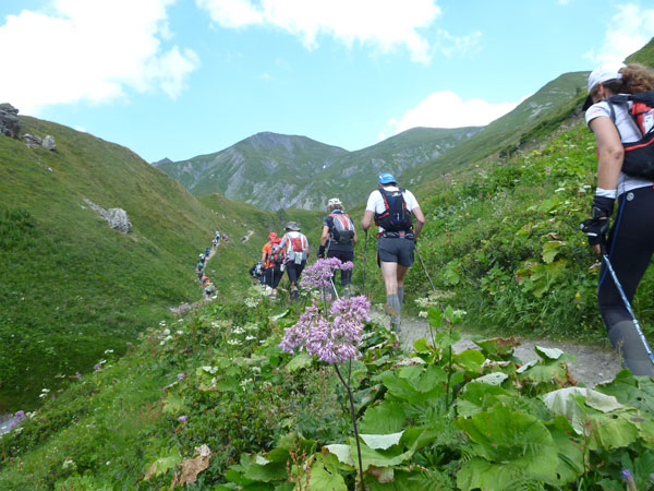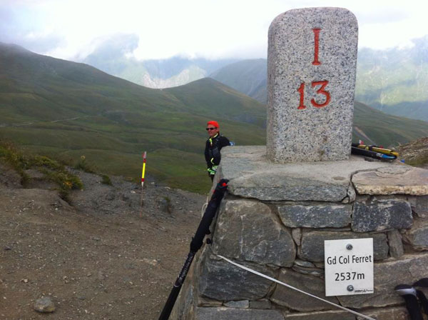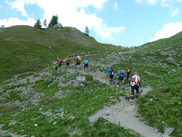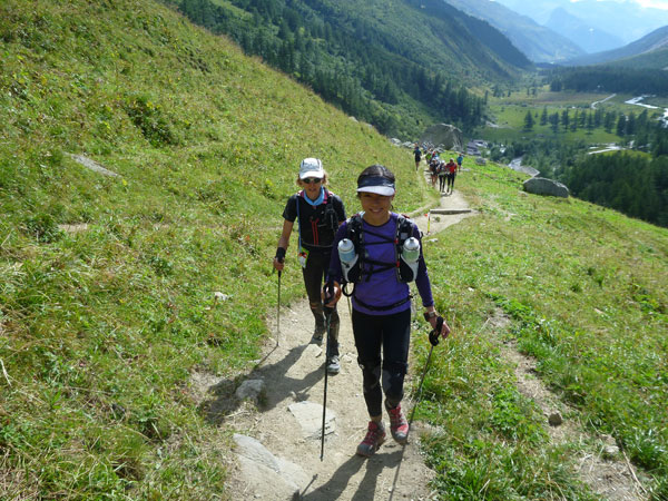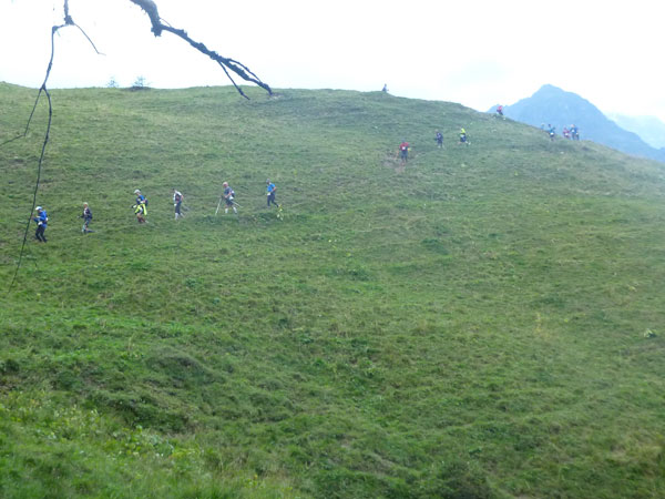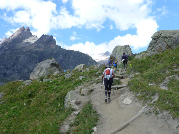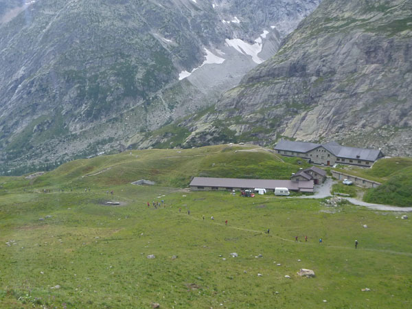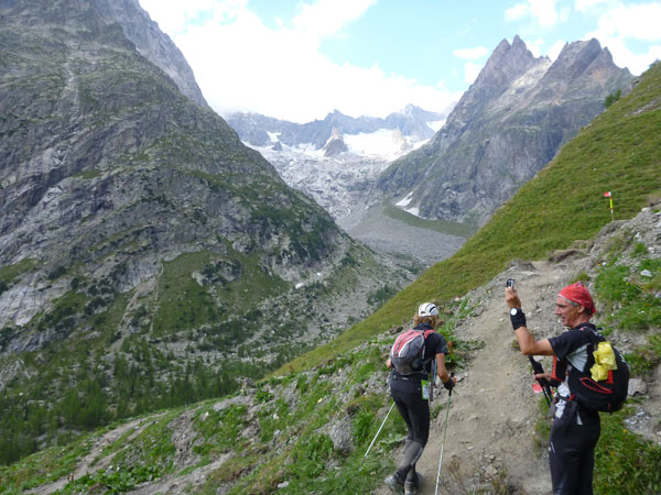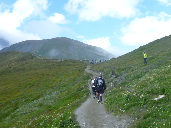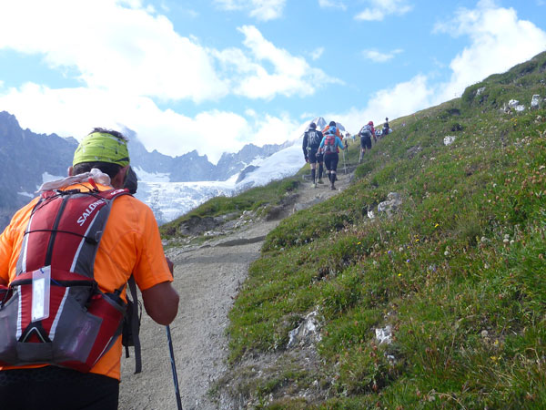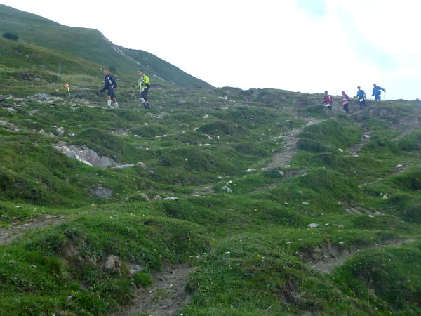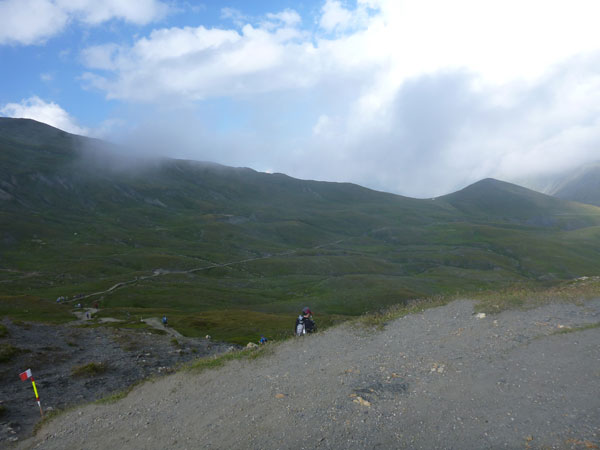 Durchgängig bis zu seinem höchsten Punkt auf 2.537 m ist der Grand Col Ferret grasbewachsen ohne sonstigen Bewuchs, er wird lediglich von kleineren Felsbändern durchzogen. So stellen sich uns keine unangenehmen Hindernisse in den Weg. Aber der Pfad hinauf ist steil und nur langsam und mühsam winden wir uns auf Serpentinen nach oben. Entschädigt werden wir aber mit einer grandiosen Landschaft. Mir gefällt besonders der Kontrast der grünen Wiesenflächen zum gegenüberliegenden steinigen Hochgebirge mit seinen schneebedeckten Gipfeln. Ein Gletscher präsentiert uns aus nächster Nähe seine weit herunterfließende weiß-graue Gletscherzunge. Ein Blick zurück öffnet uns das gesamte Val de Ferret und dazu strahlt ein weiß-blauer Himmel, der seinesgleichen sucht. Es scheint, als würde das Wetter in diesen Tagen all jenes wieder gut machen wollen, was es bei den vergangenen drei Austragungen versaut hat.