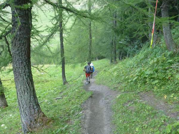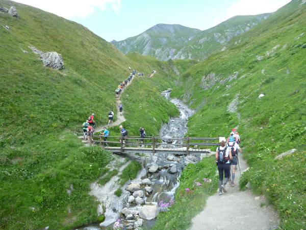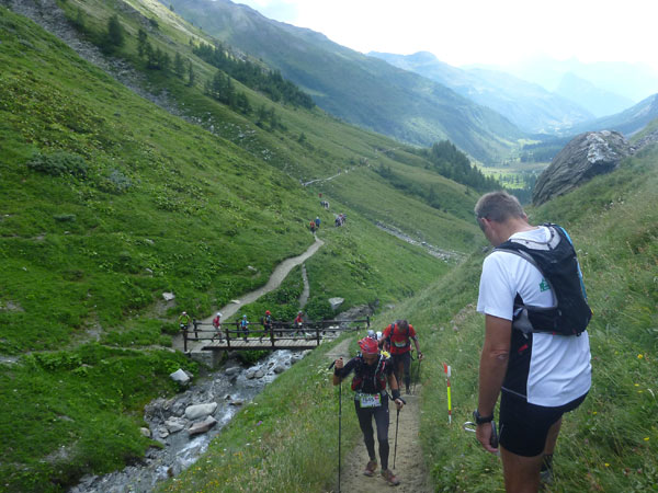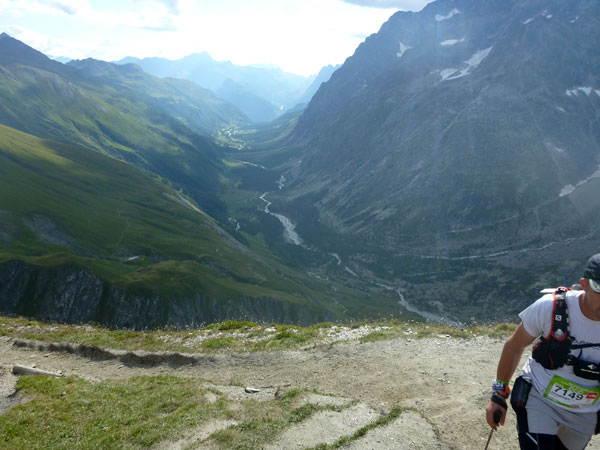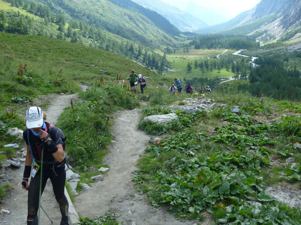 Die Hälfte der Höhenmeter und unserer Kilometer durch Italien haben wir am Gipfel hinter uns, ein elend langer, fast 20 km Abwärtslauf mit 1.500 negativen Höhenmetern liegt vor uns. Unterbrochen wird der Downhill im Chalet-Dorf La Fouly. Es gehört schon zur Schweiz. Über den Gipfel des Grand Col Ferret verläuft die Grenze. Anfangs fällt es mir noch schwer, wieder einen vernünftigen Laufrhythmus zu kommen, aber der nicht übermäßig steile Anfangsabschnitt begünstigt meine Laufbemühungen. Nach der Alpe La Peule werden die Pfade wieder steiler und anspruchsvoller.