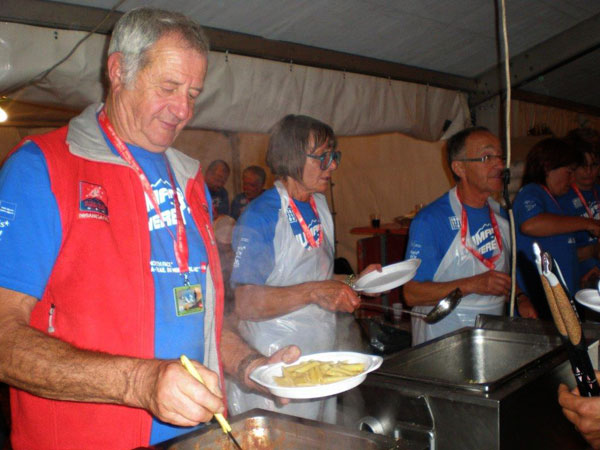 Pasta und alles Mögliche wird angeboten, ich habe keinen Appetit. Mit einer Nudelsuppe und Kaffee verziehe ich mich in eine Ecke dieses für mich ungemütlichen Ortes. Mir herrscht in dieser riesen Station einfach zu viel Trubel. Nach nur 10 Minuten sitzend fange ich an zu frösteln. Leider gibt es für den CCC keine Möglichkeit, Drobbags zu deponieren, so muss jeder Wechselkleidung selber mitführen und auch wieder weitertransportieren. Es sei denn, er hat eine/n Begleiter/in dabei. Champex-Lax ist eine der offiziellen Betreuungszonen, wo Personen mit Assistenz-Ticket Zugang erhalten.