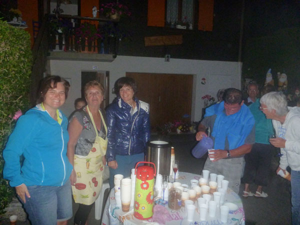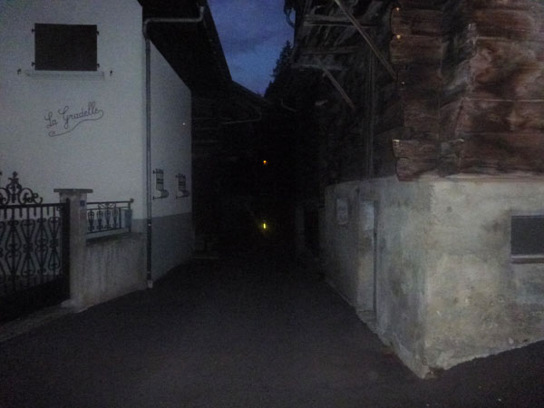 In Praz de Fort haben die Einwohner eine private Station errichtet, es gibt auch guten, starken Kaffee. Dürfte ich diesen überhaupt annehmen laut Reglement? Egal, hier sind keine Ordnungskräfte und dazu ist es dunkel. Wunderschöne alte Holzbauten gibt es im Ort zu sehen, leider ist es kuhdunkel. Immer noch geht es leicht abwärts. Die Einwohner sind freundlich, immer wieder stehen welche an der Strecke und feuern uns an, ausnahmslos mit dem Vornamen. Steht groß auf unserer Startnummer.