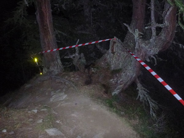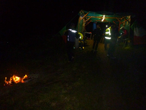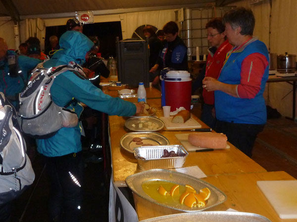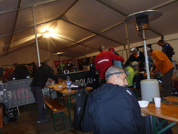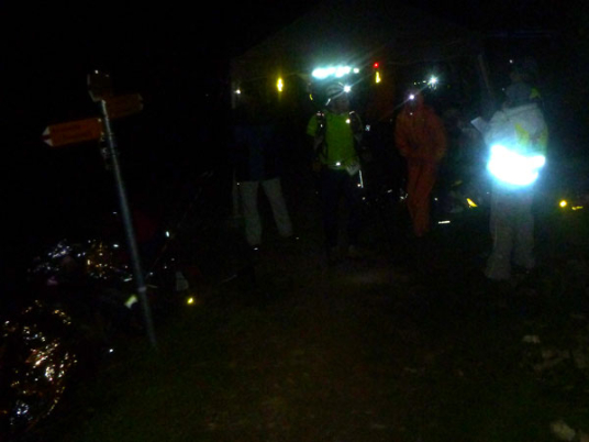 Wir verlassen den Schutz der Bäume und sind fast oben. Am Bovine ist ein Versorgungszelt errichtet, unsere Nummern werden gescannt. Verpflegung und Getränke werden wie in vergangenen Jahren leider nicht mehr angeboten, zu schwierig ist der Transport hier herauf. Die Helfer haben ein Lagerfeuer zum Wärmen angezündet. Überall verstreut um Feuer und Zelt liegen Läufer in ihre Goldfolien gehüllt. Es sieht aus, wie in einem Feldlazarett. Die wenigsten machen noch einen Muckser. Der Bovine selektiert die Teilnehmer, fordert viele Opfer. Der Schein meiner Lampe ist nur mehr schwach, ich nützte die Wärme des Feuers, um hier einen Batteriewechsel vorzunehmen. Das dauert etwas, mein Zug ist jetzt weg.
