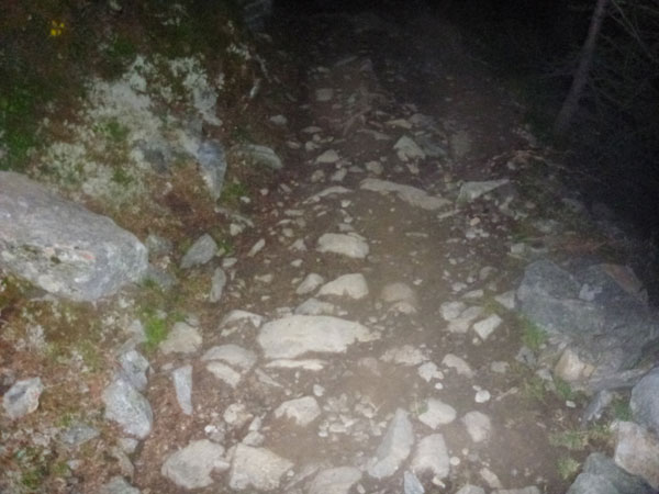 Wieder zurück am See. Ich weiß nicht, wie ich durch die Nacht kommen soll. Ich habe überhaupt keine Hoffnung, den Lauf zu überstehen. Ich schließe mich einer Gruppe Franzosen an, um irgendwie mit gezogen zu werden. Bis zur nächsten VP in Trient stehen 16 km und 900 Höhenmeter durch die rabenschwarze Nacht vor uns. Zweieinhalb Kilometer führen erst noch leicht bergab, zuerst auf Schotter, später durch den Wald. Die Gruppe wird immer größer, es entsteht ein richtiger Zug. Dann beginnt der unter UTMBlern berüchtigte Aufstieg zum Bovine. Ich sehe nur die Rückseite des Vordermannes und einen kreisförmigen Ausschnitt des Bodenbelages vor den eigenen Füßen. Den sollte man auch immer gut im Auge haben, denn das Gelände ist ziemlich unwegsam. Erschreckend ist der Blick nach oben. Dutzende von Lichterpunkten in einer endlosen Kette bis weit über uns. Das ist unser Weg.