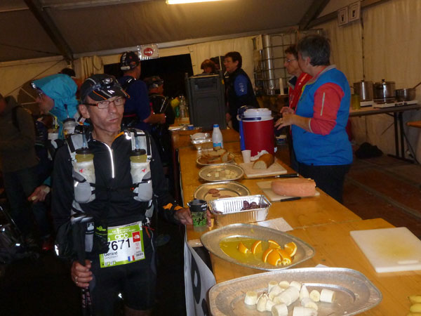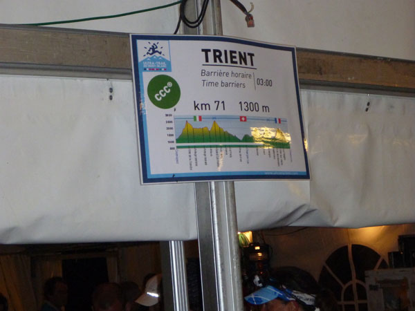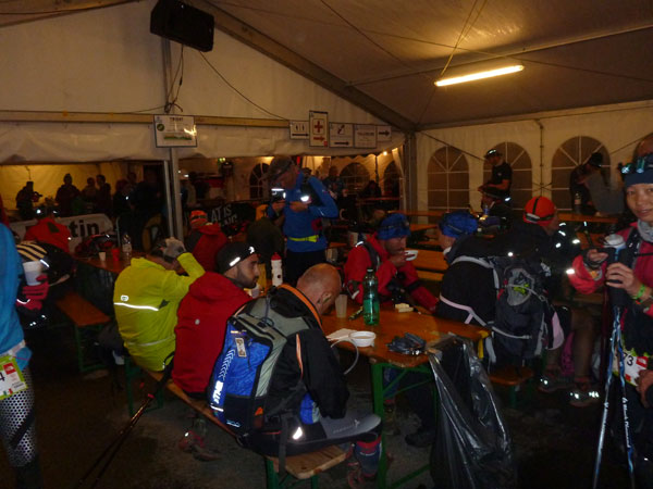 Um 6:26 Uhr passiere ich im Dämmerlicht die Zeitmessung am Zelteingang in Vallorcine. Die Cut-Off-Zeit liegt bei 6:30 Uhr. Dazu kommen noch 25 Minuten für die zweite Startreihe und Streckenverlängerung. Das ist nicht einmal eine halbe Stunde, dazu noch mit Unsicherheitsfaktor. Ich muss mich jetzt dringend aufputschen, die Müdigkeit aus meinem Körper vertreiben. Ein großer Kaffee, Cola und zwei dieser eklig süßen Gels gönne ich mir. Hunger habe ich nicht, bin nur müde. Aber ich muss weiter, die Zeit drängt.