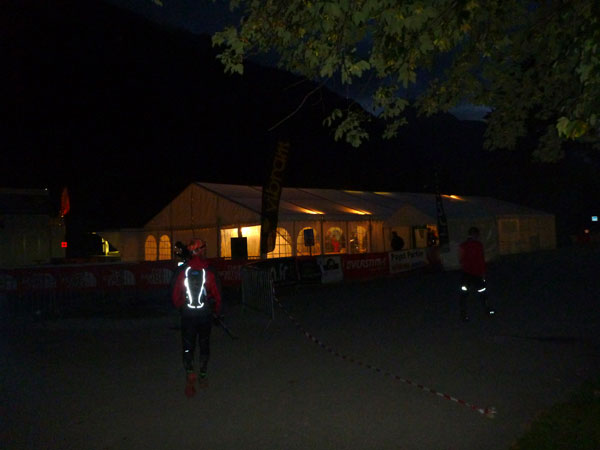 Aber auch der Abstieg ist hart, geht bei vielen bis an ihre Schmerzgrenze. Eine Läuferin sitzt am Wegesrand und weint, Minuten später kann ich ihr Klagen durch die Nacht hören. Aber ich bin jetzt stark. Die Lichter von Trient kann man schon weit oben am Berg ausmachen, bis hinunter zieht es sich noch und die letzten Kilometer sind deutlich steiler wie zu Beginn. Ein „Verrückter“ lässt am Ortseingang von Trient um 3:00 Uhr in der Früh die Bevölkerung am Lauf teilnehmen, in voller Inbrunst bläst er in sein Instrument. Ein Schleife durch Trient, jetzt Zeitmessmatten, keine Handscanner, es wird die Eingangs- und Ausgangszeit gestoppt. Ich liege knapp unter dem Cut.