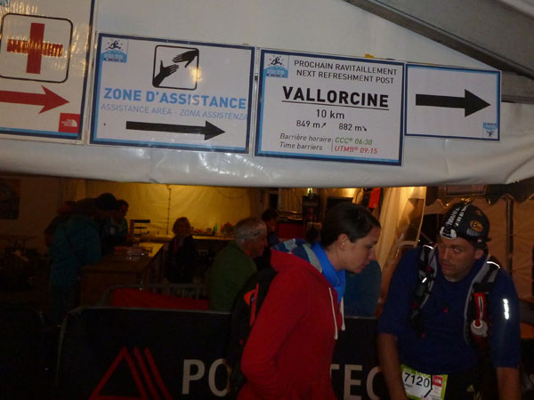 Bis zur nächsten Zeitbarriere in Vallorcine sind 10 km und 850 Hm im Auf- und 880 Höhenmeter im Abstieg zu überwinden. Man gibt uns 3,5 Stunden Zeit dafür. Detaillierte Informationen werden uns jeweils in den Verpflegungsstellen als Grafiken mit Höhendiagramm zur Verfügung gestellt. Ein toller Service. Es gibt keine Einrollphase, unmittelbar nach Ortsende geht es steil hinauf zum Catogne, wieder über 2.000 m. Ich benötige jetzt keinen Zug mehr, bin aber nie alleine unterwegs. Es sind noch sehr viele in diesem Zeitenfenster unterwegs. Ohne Schwächephase ziehe ich den Aufstieg in einem Rutsch durch. Scan am Zelt, ein Schluck Cola und weiter.