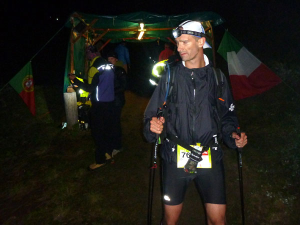 Wesentlich mehr Probleme bereiten die Abstiege. Der Tau hat Steine, Wurzeln und alles, was im Weg liegt, glitschig werden lassen. Immer wieder Fast-Stürze bei mir, meine Stöcke bewahren mich vor Bodenkontakt. Die Streckenausschilderung ist das Beste, was es in der Nacht geben kann. Meist schon von Weitem sieht man, wohin der Weg führt. Die Reflektoren an Markierungen und Bekleidung und sind das einzige, was uns durch die dunkle Nacht begleitet. Manche Trailer leuchten wie Christbäume, andere Silhouetten gleichen Robotern. Dann gibt es auch welche, die vollkommen ohne und schwarz durch die Nacht marschieren.