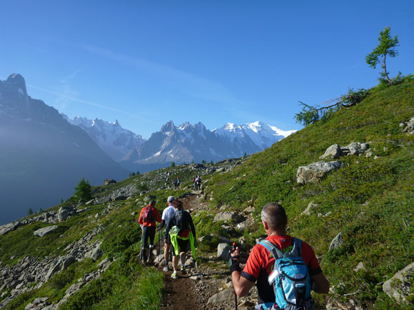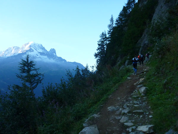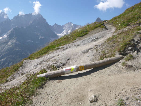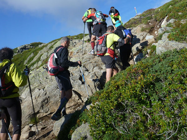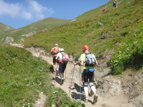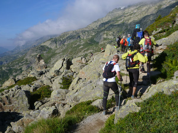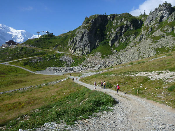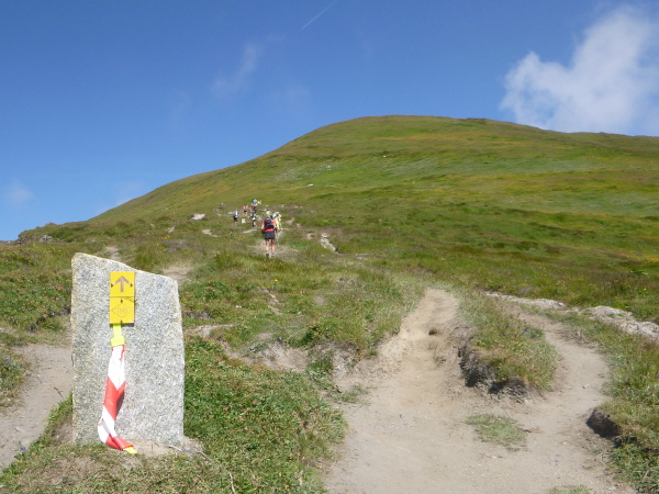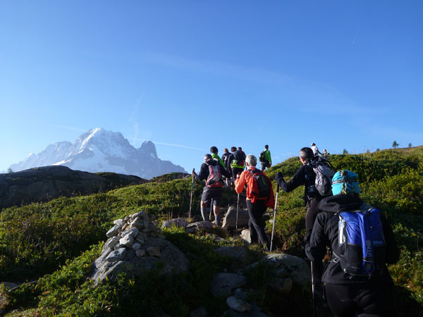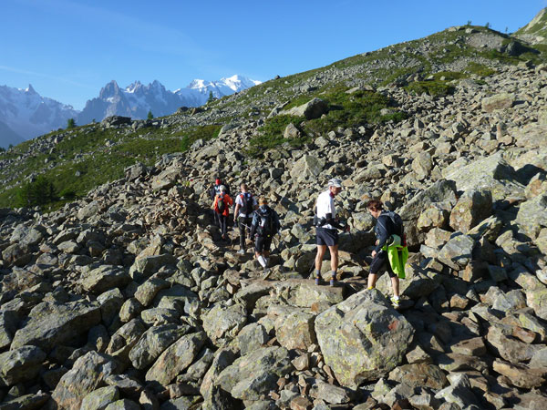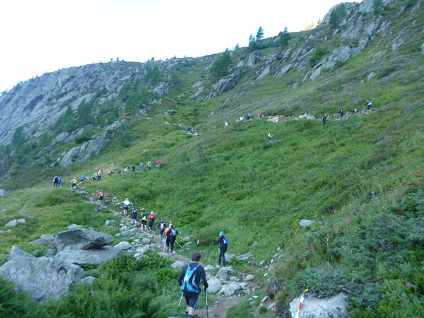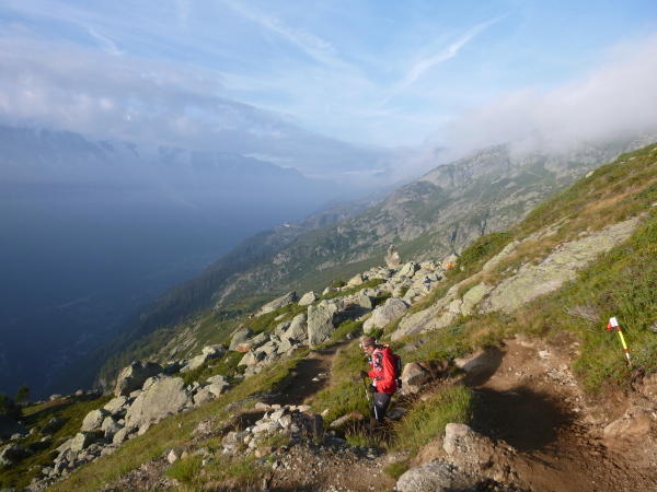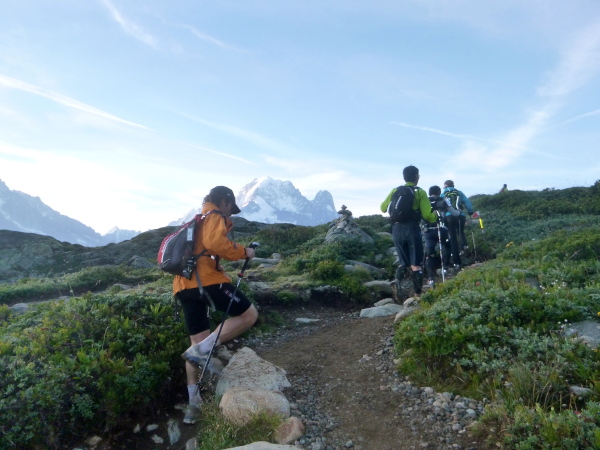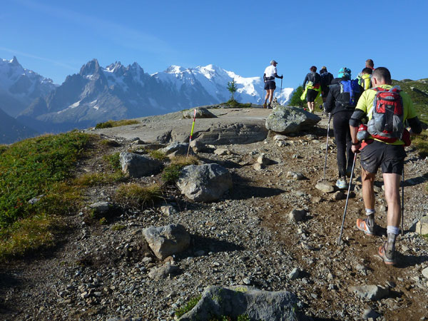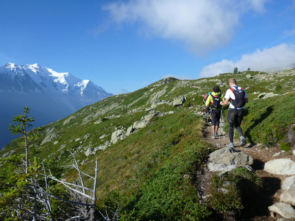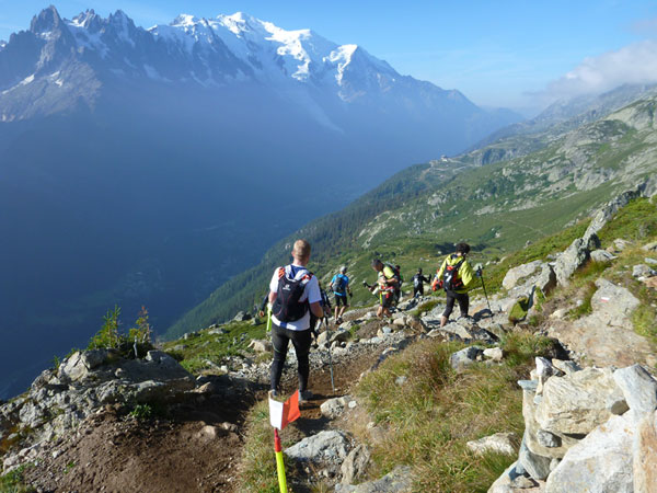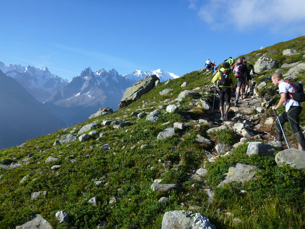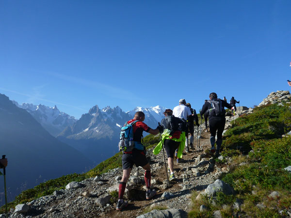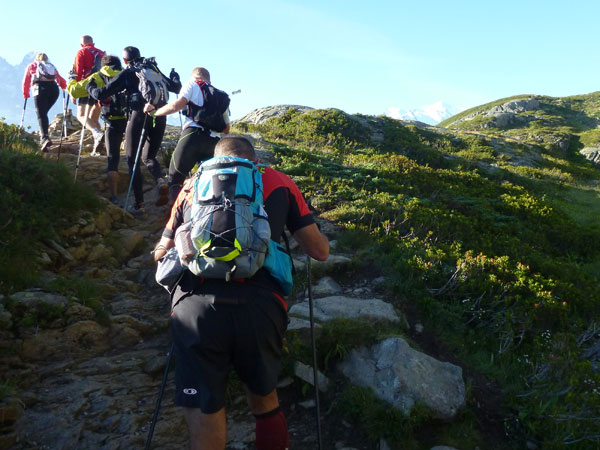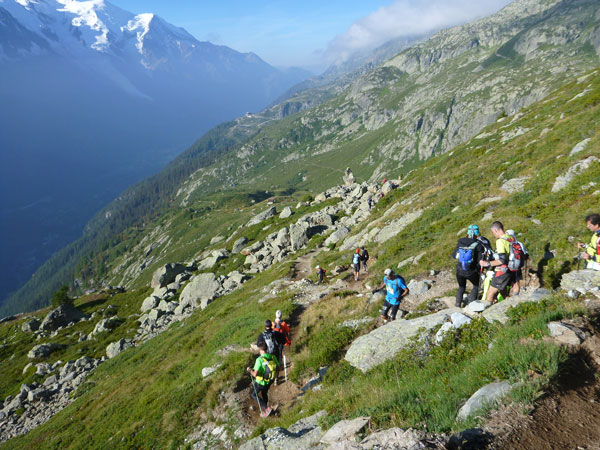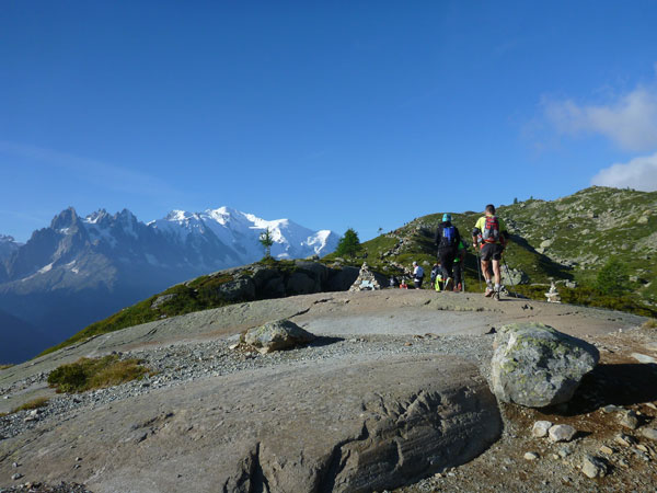 Nach Überqueren der Autostraße beginnt der letzte strenge Anstieg über den Tête Aux Vents nach La Flégère. Es bleibt uns nichts erspart, es ist einer der steilsten Abschnitte des kompletten Kurses über Steine und Felsen. Dazu ist der schmale Pfad um diese Zeit stark frequentiert, viele Wanderer und auch Gleitschirmflieger sind bereits unterwegs. Aber es ist auch ein Aufstieg der sich lohnt. Noch unterhalb des höchsten Punktes erhebt sich majestätisch der „weiße Berg“ in den strahlend blauen Himmel vor uns. Zum ersten Mal ist er für die Teilnehmer des CCC von diesem Streckenabschnitt aus zu sehen.