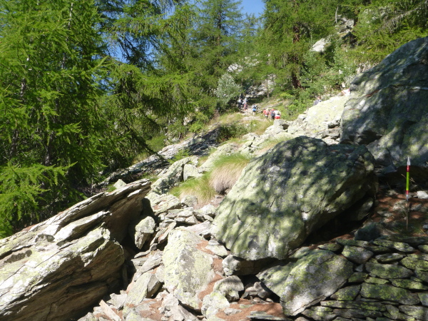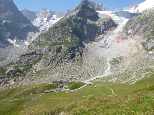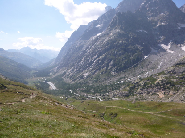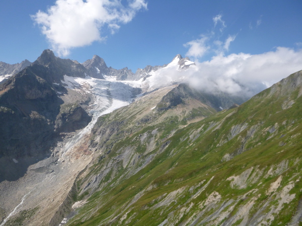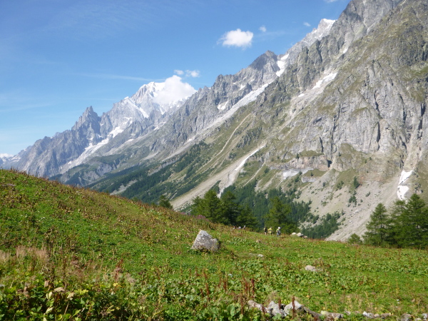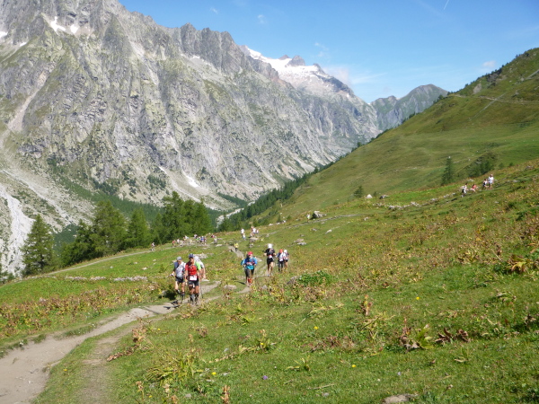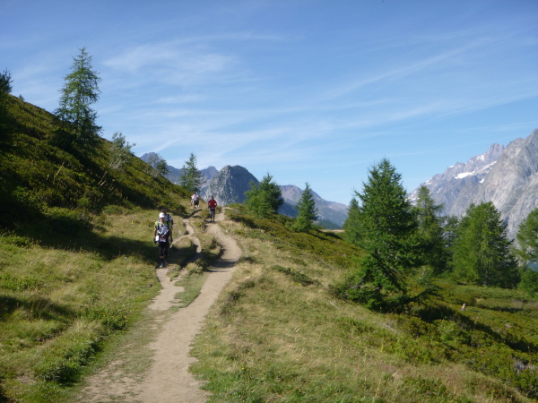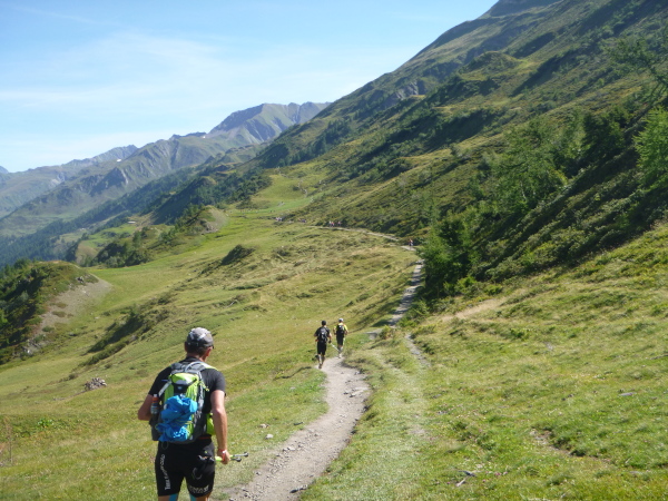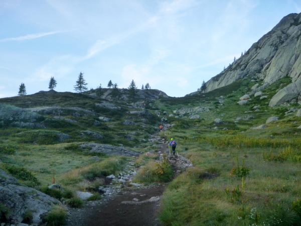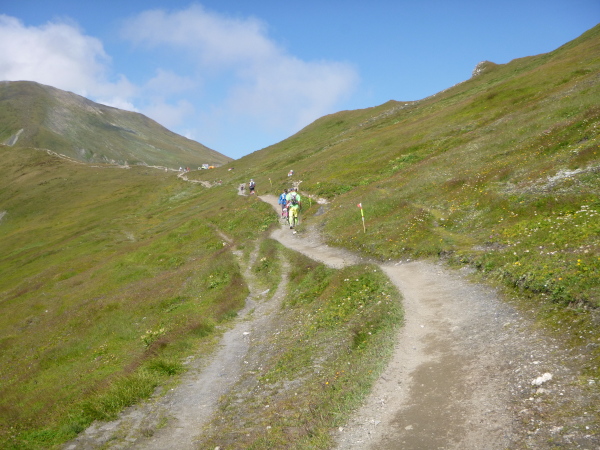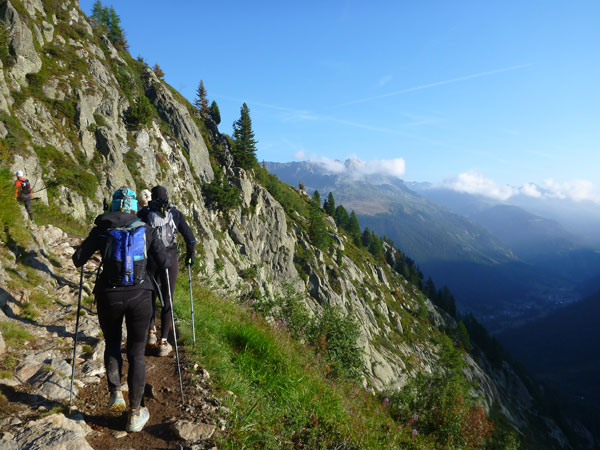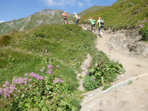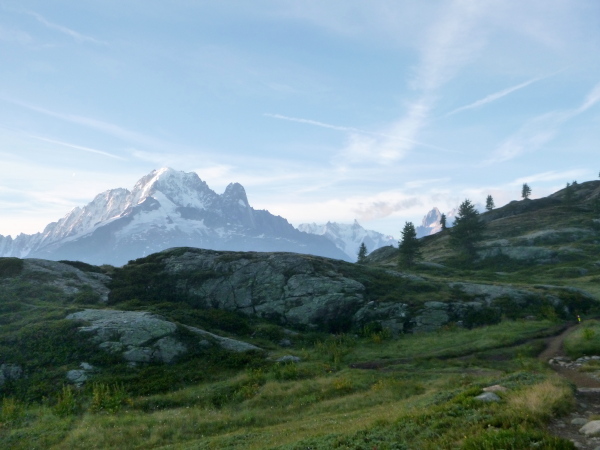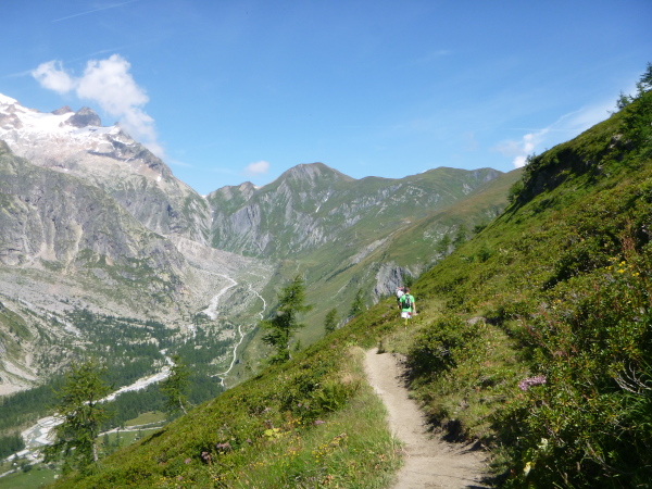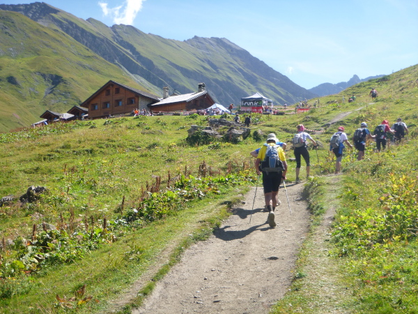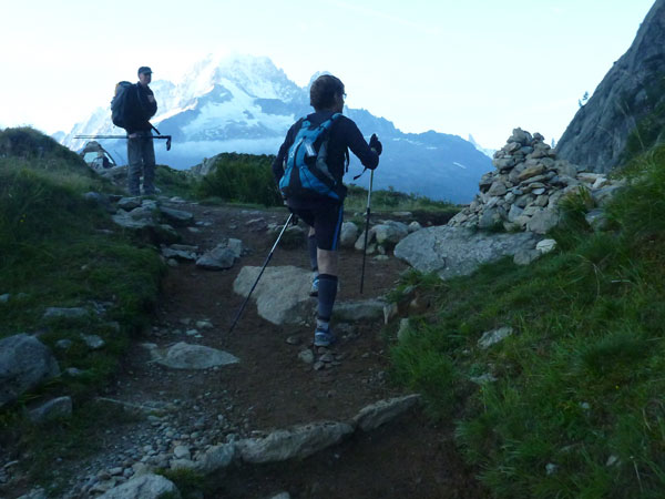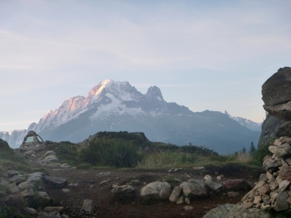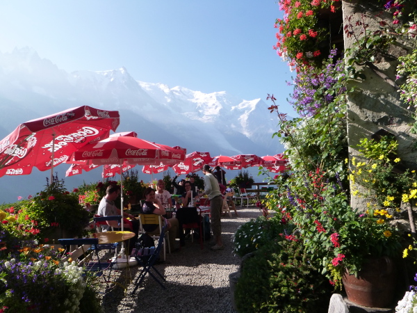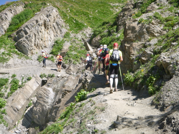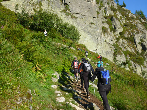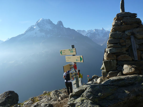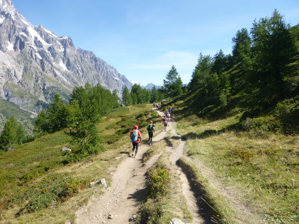 Nach Überqueren der Autostraße beginnt der letzte strenge Anstieg über den Tête Aux Vents nach La Flégère. Es bleibt uns nichts erspart, es ist einer der steilsten Abschnitte des kompletten Kurses über Steine und Felsen. Dazu ist der schmale Pfad um diese Zeit stark frequentiert, viele Wanderer und auch Gleitschirmflieger sind bereits unterwegs. Aber es ist auch ein Aufstieg der sich lohnt. Noch unterhalb des höchsten Punktes erhebt sich majestätisch der „weiße Berg“ in den strahlend blauen Himmel vor uns. Zum ersten Mal ist er für die Teilnehmer des CCC von diesem Streckenabschnitt aus zu sehen.