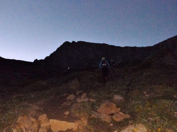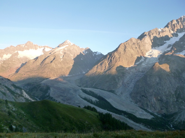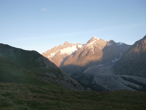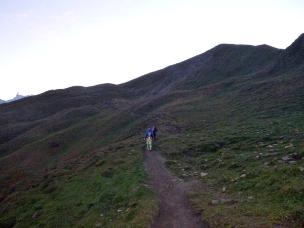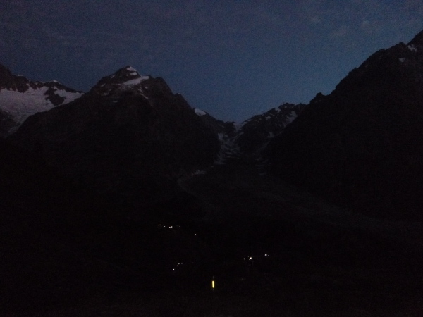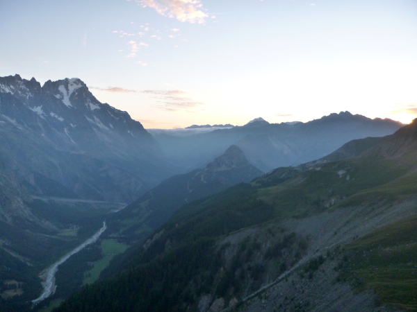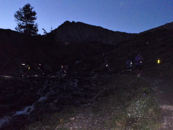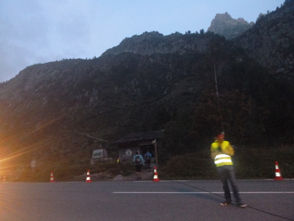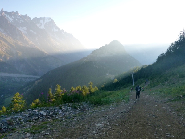 Als ich das Zelt verlasse, ist es fast hell, innerhalb ein paar Minuten ist die Nacht gewichen. Aber auch meine Müdigkeit. Noch ein Berg muss bezwungen werden, knapp am Zeitlimit. Ich stehe jetzt unter Hochspannung. Meine Weste wartet im Ziel in Chamonix. Die ersten 4 km bis zum Col de Montets sind nur mäßig steigend, man kommt gut voran. Es geht an der L’Eau Noire entlang. Stopp, ich muss anhalten, laufe im Tageslicht ausschließlich mit meiner Sonnenbrille, mit ihr fühle ich mich am wohlsten.