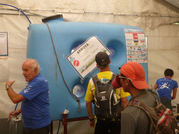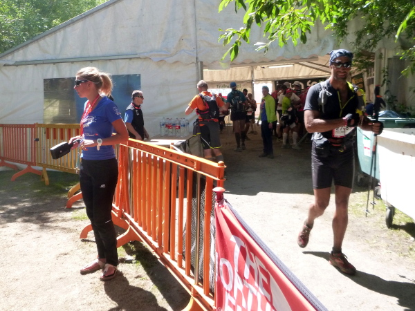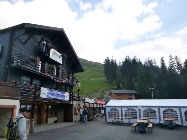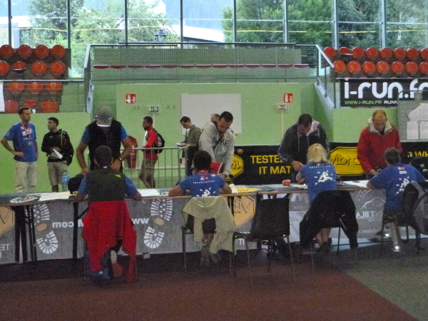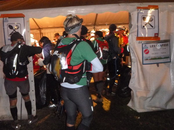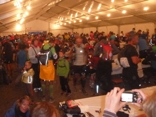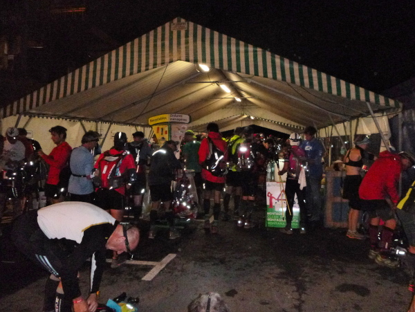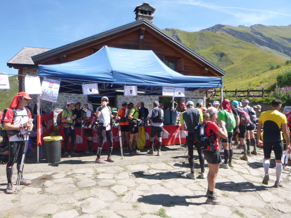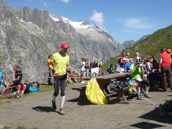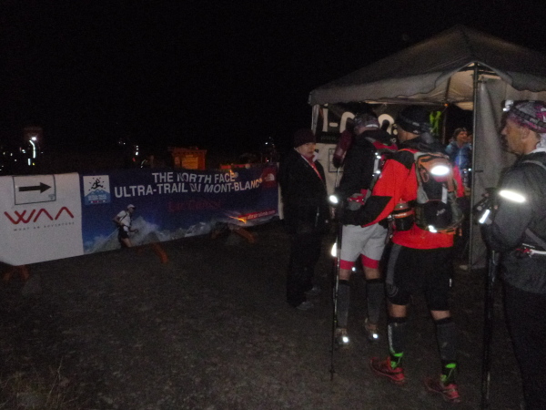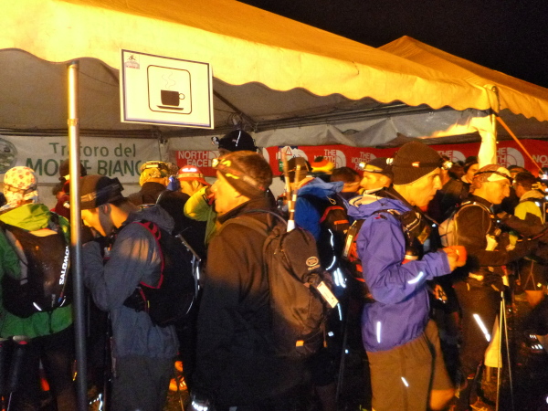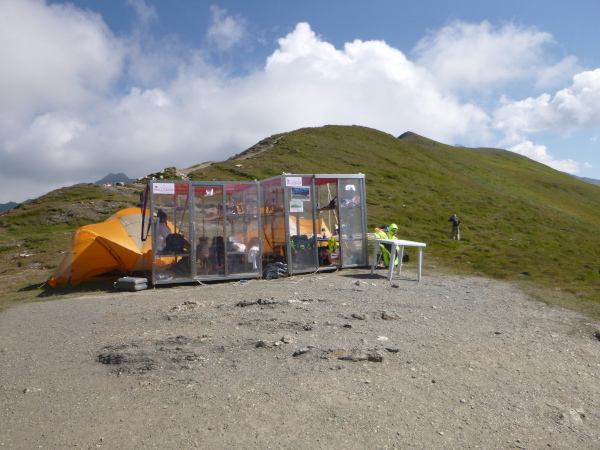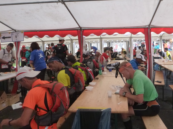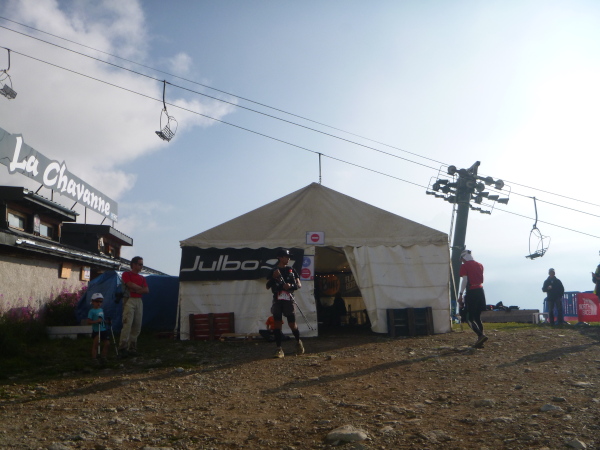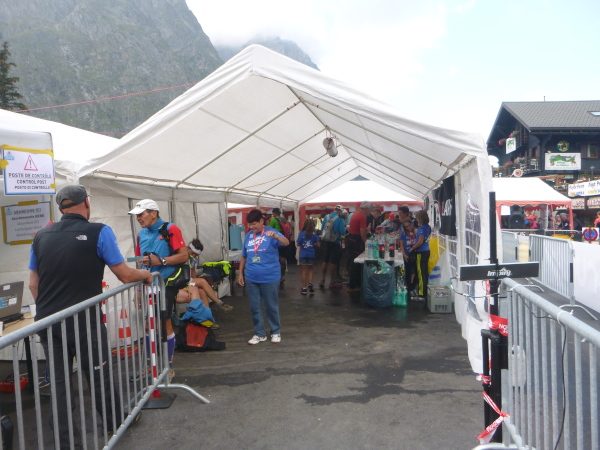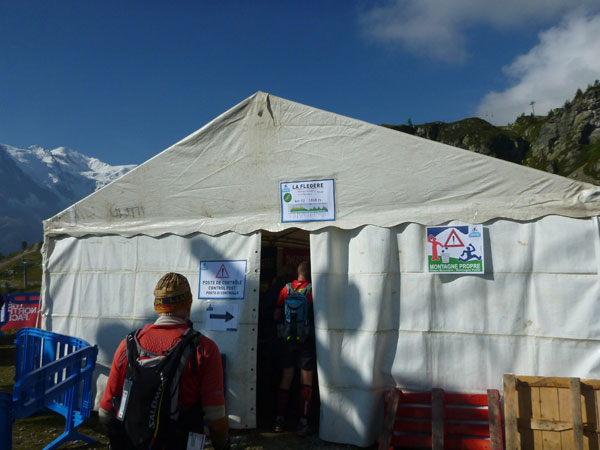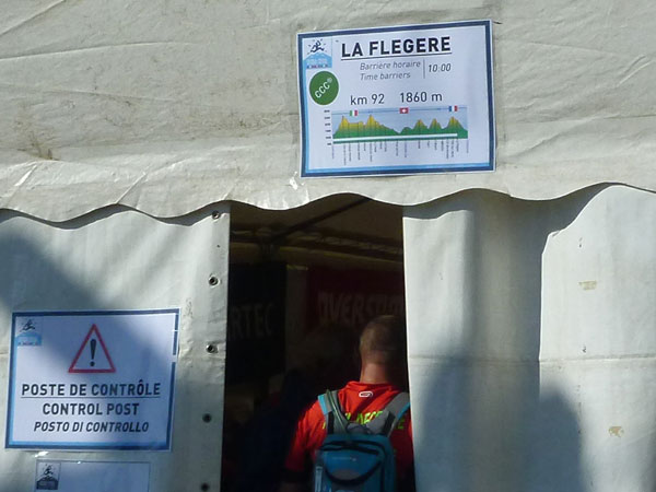 In der Ferne ist ein Zelt und die Liftstation von Les Praz herauf zu sehen. Am Zelteingang wird gescannt? Wir sind jetzt erst in La Flégère? Verdammt, ich habe Tête Aux Vents mit La Flégère verwechselt. Die Seilbahnstation heißt so, hätte ich wissen müssen, wir waren erst am Dienstag hier oben. Beim Läufer vor mir kontrolliert der Ordner bereits die Liste mit den berechneten Durchgangszeiten, womit man noch innerhalb des Cuts bleibt. Bei mir klingeln sämtliche Alarmglocken. Hey Leute, ich lasse mir meine Weste nicht mehr entreißen. 9:51 Uhr, ich darf noch durch. Zeitlimit 10:00 Uhr. Ok, ich war 2. Startreihe. 1:20 Std. sind vom Veranstalter für den Schlussabschnitt bis ins Ziel berechnet. Das wird eng.