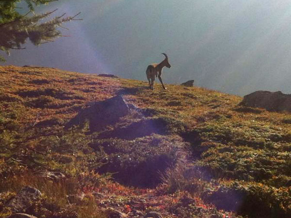 Um ein paar Minuten verpasse ich einen weiteren Höhepunkt. Tom läuft nur wenige Minuten vor mir und macht den Schnappschuss des Tages. Eine Steinbockherde quert unsere Laufstrecke. Aus etwa 10 Meter Entfernung kann er einen Bock mit seinem Handy ablichten. Danke für das Foto.