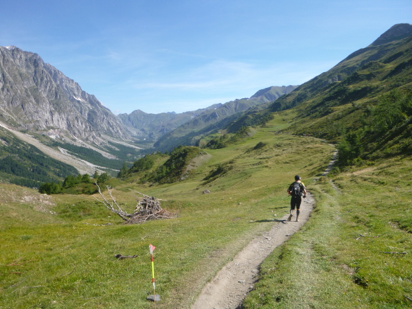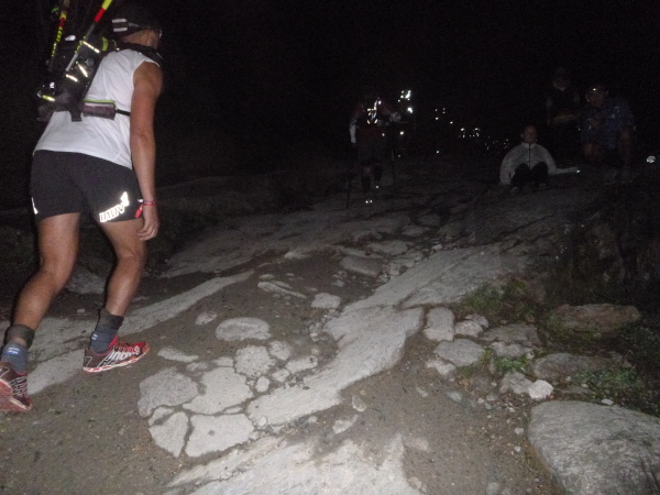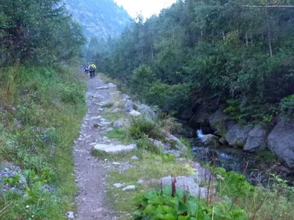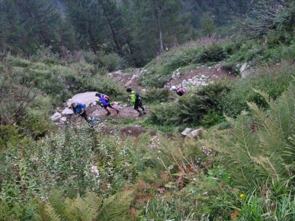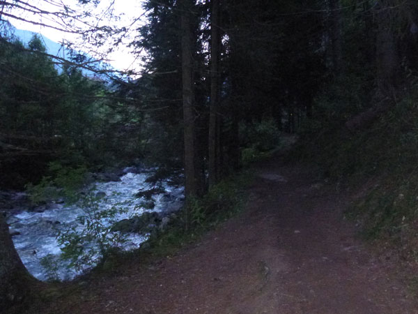 Nach einigen Kilometern endlich eine Kiesstraße, ich kann noch einen Zahn zulegen und es macht jetzt richtig Spaß, durch die Rinnsale zu brettern. Aber Chamonix liegt immer noch weit unter mir, es ist noch ein Stückchen. Meine GPS-Uhr steigt aus, die Kilometer werden nicht mehr weitergezählt, dabei bin ich doch im Dauerlauf. Mir ist aber bewusst, dass die Zeit jetzt locker reichen wird. Ich kann aber auch nicht mehr einen Gang runterschalten, bin so richtig im Flow.