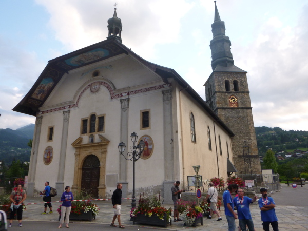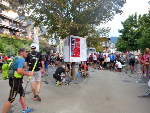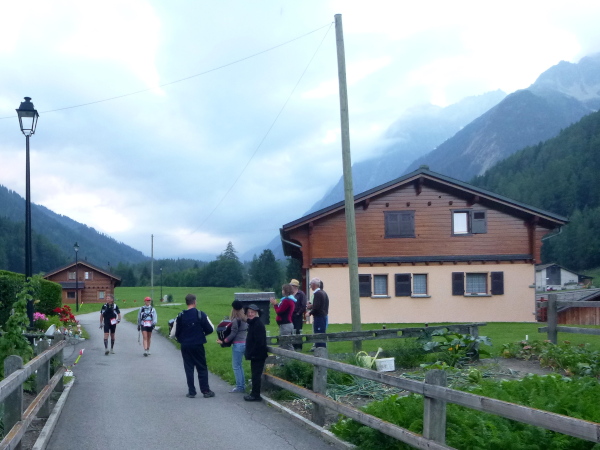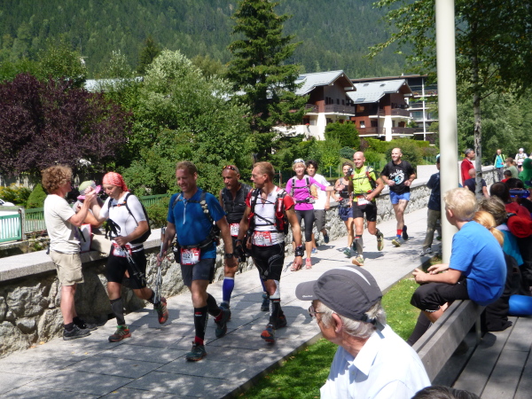 Spaziergänger jubeln mir zu. Am Ortsrand beginnt die Teerstraße, es sind jetzt vielleicht noch maximal zwei Kilometer. Ich schwebe regelrecht durch die Straßen. Auch getragen von dem besonderen Spirit, den der Ultra-Trail du Mont-Blanc auf uns Trailer ausübt. Überall Anfeuerungen von den Menschen. Man honoriert auch die Leistungen von uns Nachzüglern.