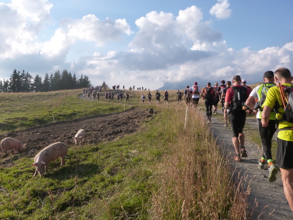 Plötzlich Stau, einen Teilnehmer hat’s zerbröselt. Viele kümmern sich um ihn. Ich komme nicht vorbei, zu eng hier. Er steht wieder auf und kann weiter machen. Schwein gehabt, es geht weiter, der Stau löst sich auf. Die ganze Gruppe schnappe ich mir in einem Handstreich. Bin jetzt auf Hochtouren, es läuft super, vollgepumpt mit Adrenalin. Meine Stöcke bewahren mich wiederholt nur knapp vor Stürzen. Und immer wieder riskante Überholvorgänge auf engsten Raum. Mir doch wurscht, ob die jetzt denken, ich sei ein Irrer. Ich hole mir meine Finisherweste, ihr könnt hier rumtrödeln.