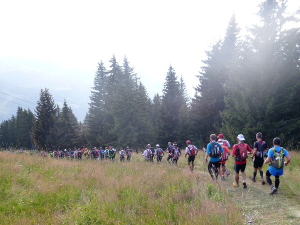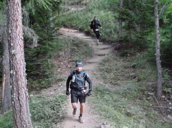 Einen Becher Cola im Laufschritt wie beim Straßenmarathon gönne ich mir, steh‘ jetzt völlig unter Strom. Erst noch kurz bergauf zur Liftstation. Danach einige hundert Meter über eine Schotterstraße. Sie ist steil und unangenehm zu laufen, aber ich komme in Fahrt. Dann geht’s in den Wald. Hört sich gut an, ist aber grauenhaft. Wurzeln, Steine und Stolperfallen en masse. Und steil. Viele sind noch unterwegs, die Überholvorgänge gestalten sich schwierig. Scheinen alle noch jede Menge Zeit zu haben. Seht doch mal auf eure Uhren! Die rote Weste wartet auf mich.
