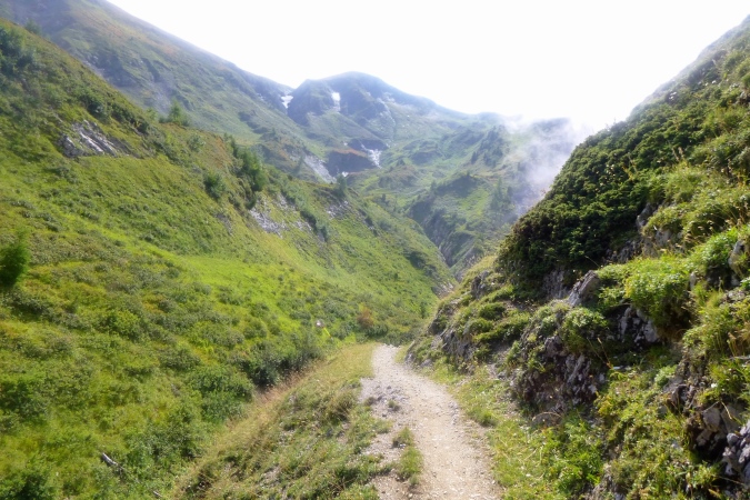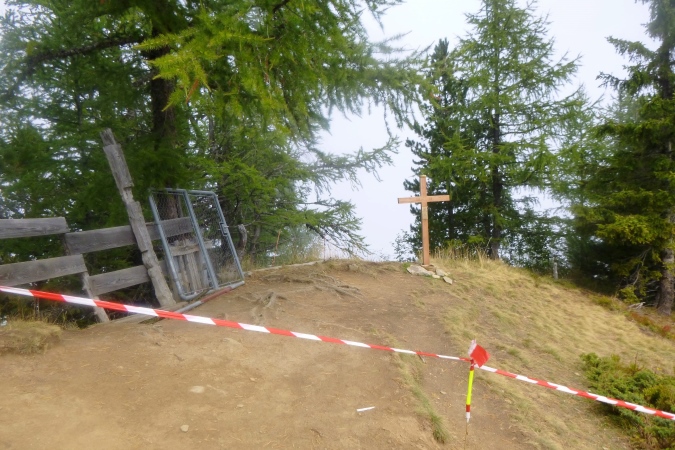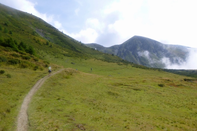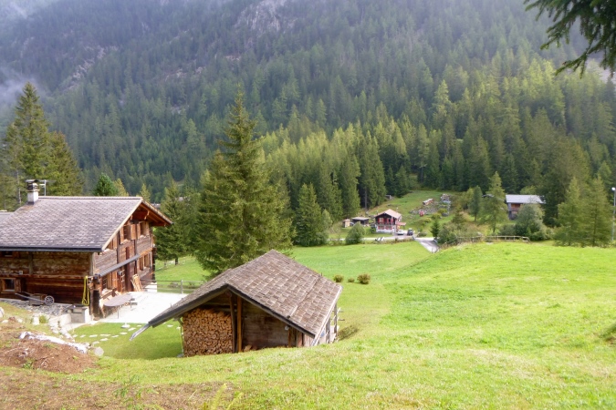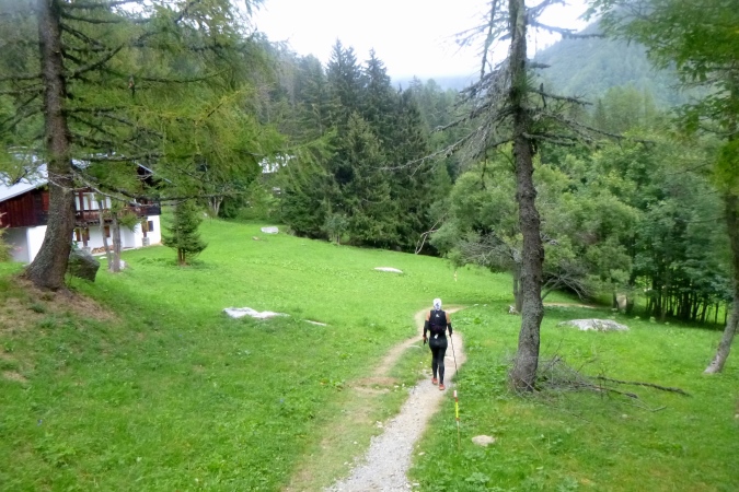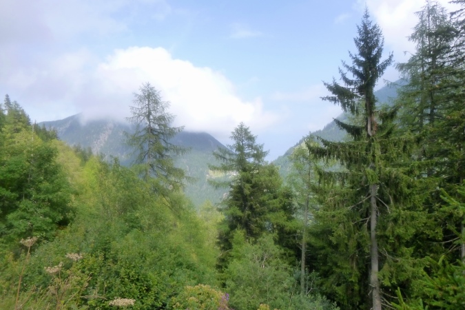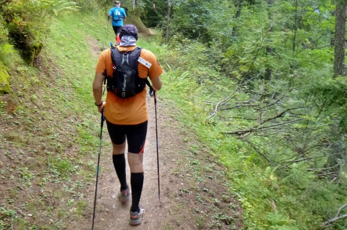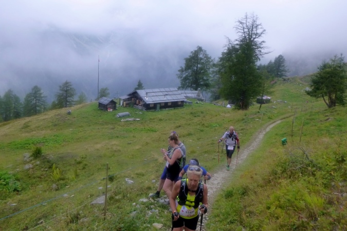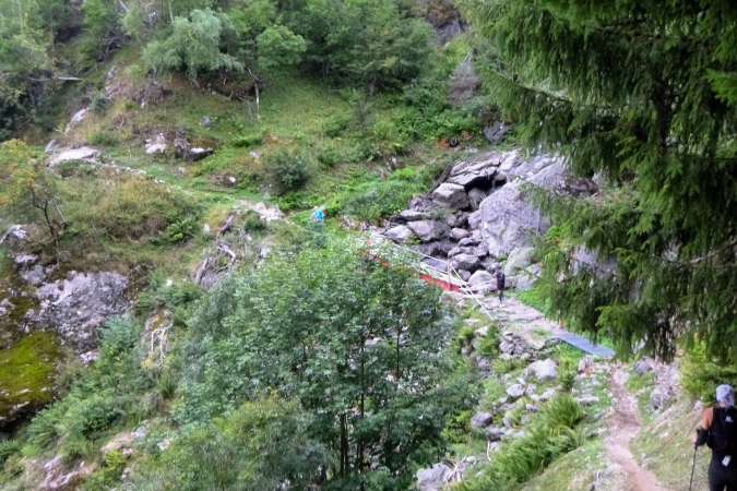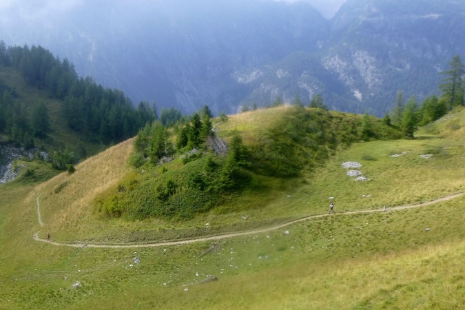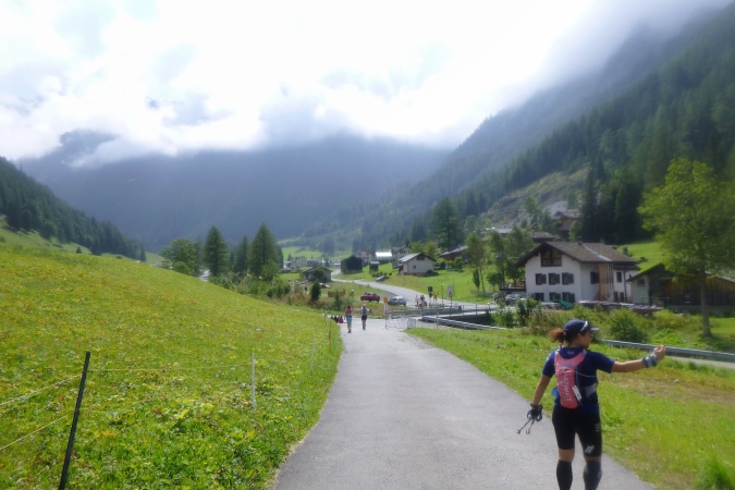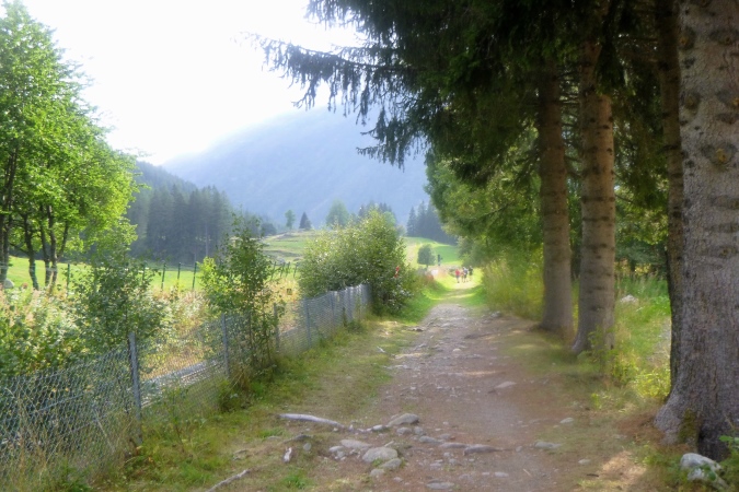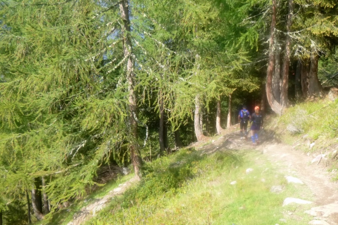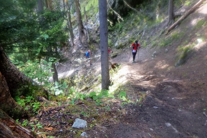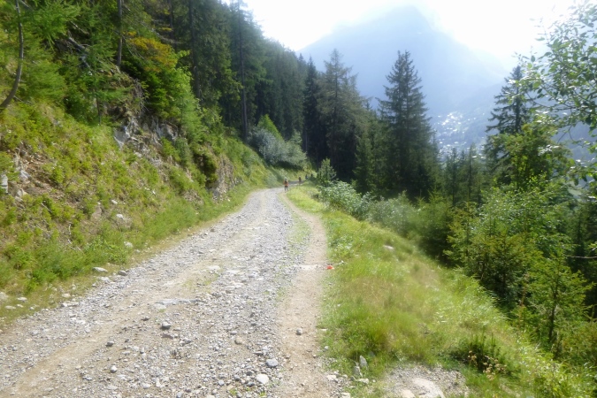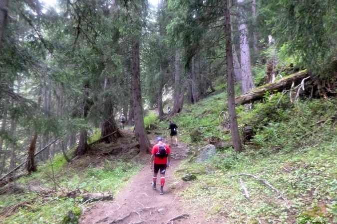 In einem stinkenden Stall kann man sich an Wasser laben, man kann aber auch flott weiterlaufen. So kriegt man die Leute auf die Strecke zurück. Zum Forclaz-Paß ist es nicht weit und der Weg ist auch besser. Es reicht für ein gleichmäßiges Laufen. Immer wieder tun sich schöne Ausblicke auf. Am Pass scharf links und auf breitem Weg weiter. Eine Lawine hat den Weg zerstört, ein Behelfspfad führt oben vorbei; die Straßenquerung erfolgt über eine Brücke extra für uns. Nach Trient schrauben sich dann steile Serpentinen durch den Hochwald runter.
