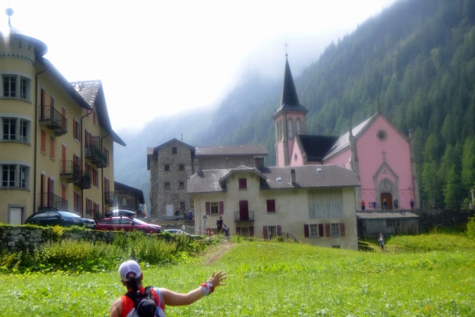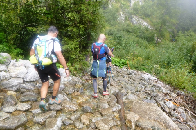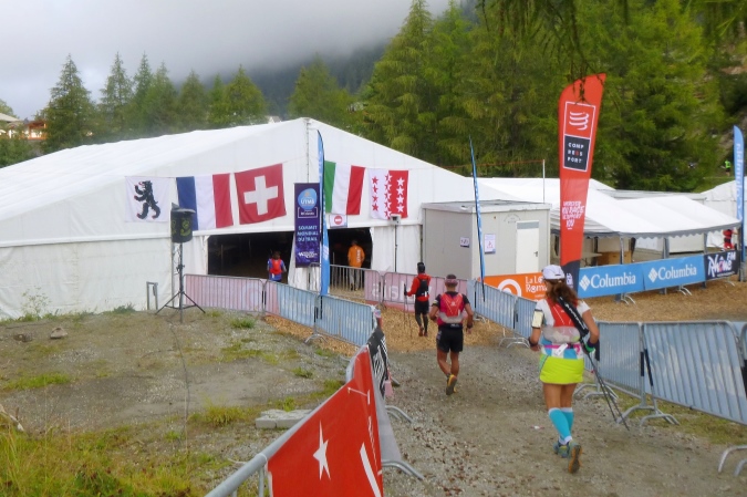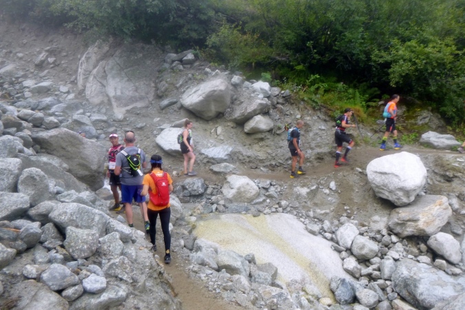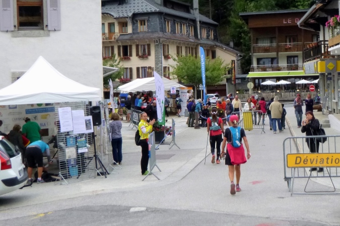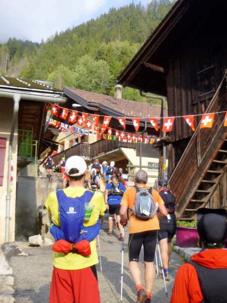 Ein prima Trail bringt uns in die Tiefe, bis zu einem Skilift. Da folgen wir einem breiten Zuweg, bevor wir auf Trails in den Ort laufen. Am Fluss entlang, einmal hin- und herüber, ins Zelt, zur Cola. Die gibt’s noch und die Welt ist wieder in Ordnung. Und auch die cutoff-Frist ist auf einmal wieder in angenehme Ferne gerückt… Pause kann man im Zelt machen oder auf der Strecke. Die ist nun flach und, kaum zu glauben, auch laufbar. Ein kleiner Pass noch, der Col de Montets, 200m höher gelegen, dann nach Argentiere runter. So jedenfalls das Höhenprofil. Man freut sich.