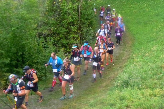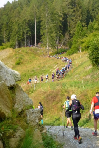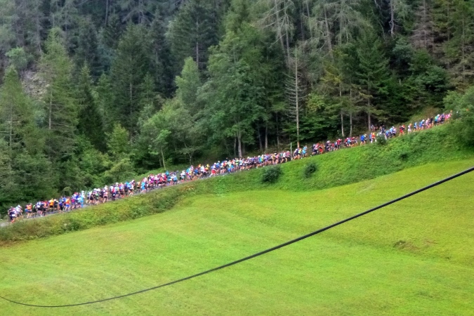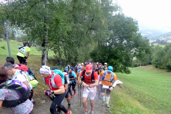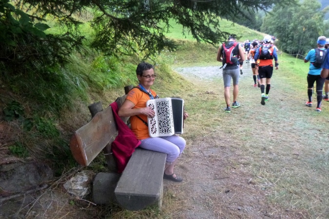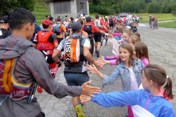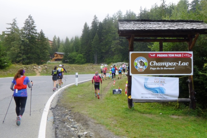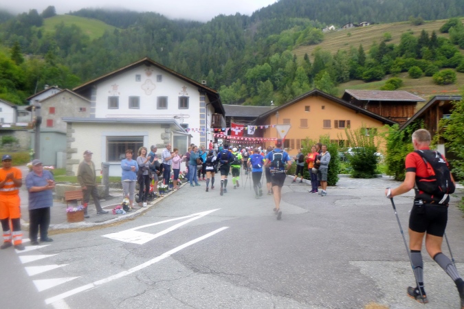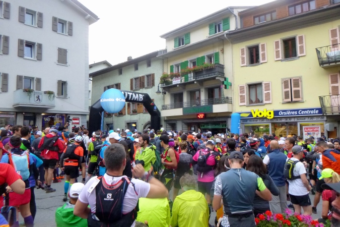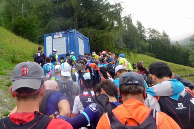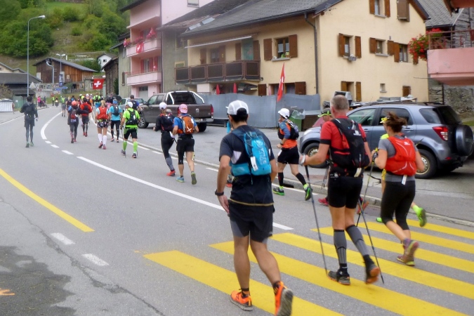 Sehr früh (um 5 Uhr), fast noch in der Nacht, fahren die Busse los. Weit über eine Stunde dauert die Fahrt nach Orsieres in der Schweiz. Kaum ist ein Bus voll, geht’s auch schon los. Tipp hier: früh fahren, denn dann sind die Schlangen vor dem Dixi noch nicht so lang. Kaffee und Brot servieren uns die freundlichen Schweizer. In dem Gewühl von über 1500 Leuten begegnet mir Riccardo (vom T88), der seine Tochter zum Start bringt; er tritt später zum großen UTMB an. Und noch ein Kontakt entsteht zu Raffaele, gestern haben wir zusammen in der Warteschlange gestanden. Wir werden das gemeinsam anpacken. Nur ruhig.