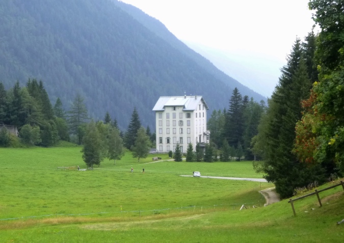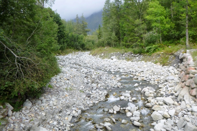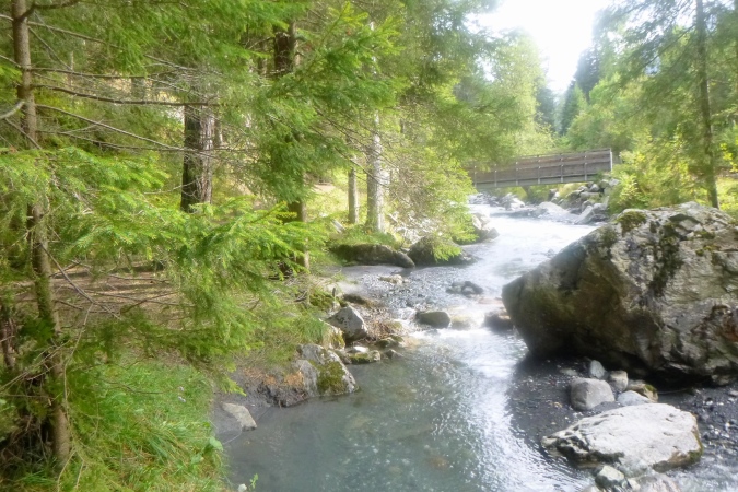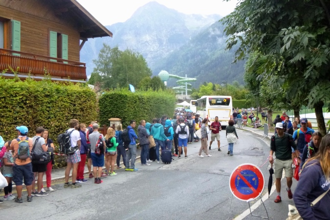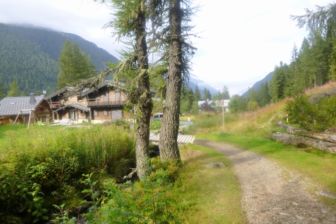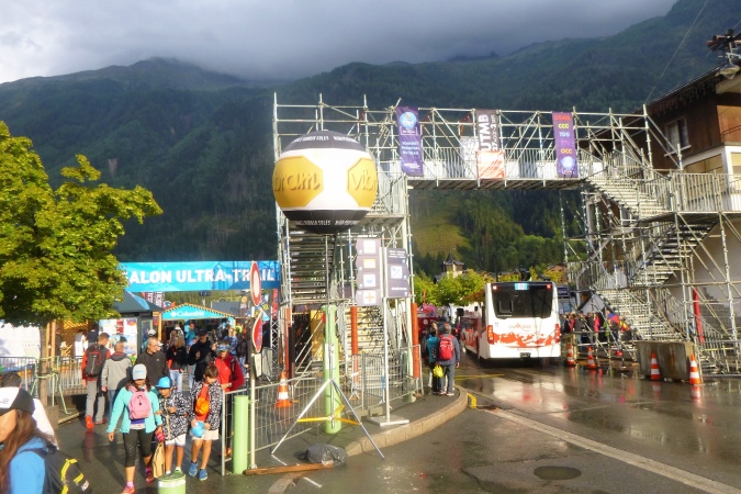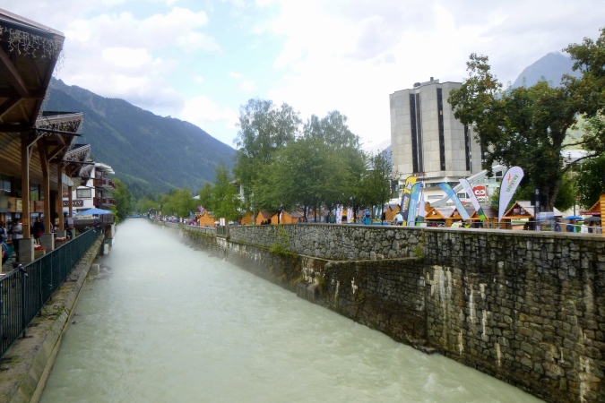 Eine wunderschöne Hütte, La Floria, mit tollem Blick über Chamonix und die Berge, (ein Geheimtipp fürs Wandern, mit Restauration), bedeutet das Ende der Probleme. Es gibt einen Fahrweg, auf dem der Wirt Nachschub heranfährt. Man kann nun Gas geben. Von links unten tönt laute Musik herauf. Das kommt aus Les Praz, einem Vorort, und hat nichts mit dem Trubel am Ziel zu tun. Darauf steuern wir jetzt aber geradeaus zu. Noch ein paar Kurven, ein, zwei Bäche, am Wasser- oder E-Werk vorbei. Hart schrammen wir über ein Stück Asphalt, dann noch ein wurzeliger Trail von 50 m. Aufpassen! Unten müssen wir über eine Straße. Links und rechts gucken ist aber nicht nötig. Es gibt auch keinen Posten, sondern eine 5m hohe Brücke. Also hoch und drüben runter zum Fluss. Links das bekannte Centre sportif, also nur noch geradeaus über die Promenade, am Messegelände längs. Und wieder so eine Hochbrücke, wieder 5m hoch.