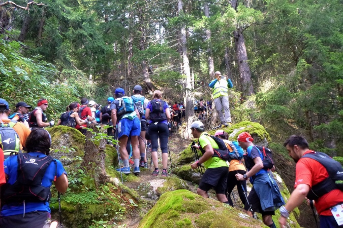 Vollversorgung im Ort – so der Plan. Nur die Cola ist alle. Was das heißt, ist klar. Und dann die Cutoffzeit. Meine Reserve ist gering, also weiter. 840 hm folgen. Nicht ganz der originale Weg, da sind Holzarbeiten im Gang. Für uns heißt das atemberaubend steile, kurze Serpentinen hoch, es gibt kein Flachstück. Les Tseppes ist mal wieder etwas mit Zeitnahme, ein ermutigendes Schild weist auf weitere 100 hm hin. Aber die sind okay, man kann teilweise sogar laufen. Links liegt Catogne, ein Grenzberg. Der bleibt da auch, wir müssen nicht hoch, sondern runter, nach Vallorcine ins Tal. Ins Tal, wo auch Chamonix liegt, nur noch weiter links, außer Sicht. Aber der Blick in die Runde ist genauso atemberaubend wie es der Aufstieg war. Überall 3-4000er, darunter diverse Aiguilles, enorm und gewaltig. Ich möchte mich setzen und gucken. Eigentlich. Aber da ist die verflixte cutoff-Frist…