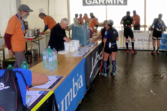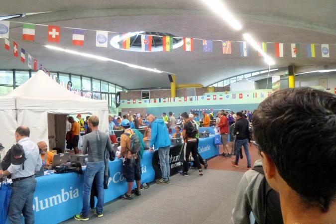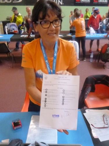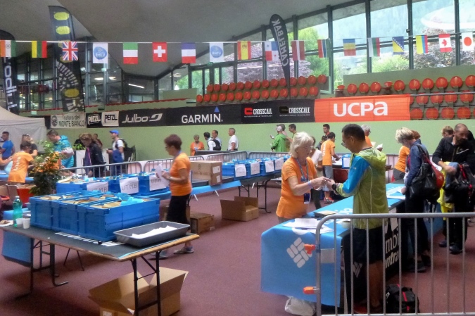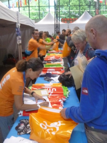 Als ich ankomme, ist die Warteschlange bereits sehr lang und prompt fängt es an zu regnen. Fast 45 min im Regen – ein guter Test für die Schutzjacken. In der Halle erstmal Ausweiskontrolle . Dann bekommt man einen Laufzettel und eine Schale. Dahinein legt man seine Opfergaben für die Götter der Prüfstelle. Diesmal sind Rucksack, Wassersack, das Handy und die wetterfeste Jacke gefragt. Die Götter sind zufrieden, dann erhält man die Startnummer, ein Armband, einen Tracker an den Rucksack und zum Schluss das Shirt. Wer noch Transport braucht, kann noch nachbuchen. Kleiner Tipp: Das Prozedere kann man auch an den Startorten erledigen, es ist dort wesentlich entspannter. Nur: wenn doch was fehlt, kann man es hier in der Stadt oder am Salon Ultra-Trail ganz leicht nachkaufen.