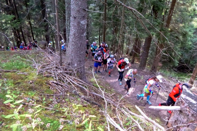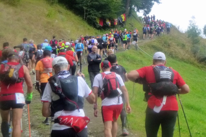 Die Ruhe ist schlagartig vorbei, als der Startschuss fällt und der bunte Lindwurm lostrabt. Ganz toll: die Kinder stehen schulklassenweise an der Strecke und lassen sich abklatschen. Dann verschwinden wir im Wald. Kaum außer Sicht, wird gewandert. Schon die ersten Anstiege sind mörderisch. Und es ist eng. Stockspitzen, Ellbogen, Gerempel. Überholer, die nach zwei Metern aufgeben. Downhill wird es wieder sehr schön, dafür sind mal wieder alle Höhenmeter futsch. Zwei kleine Dörfchen, mit Fahnen bunt herausgeputzt und mit jubelnden, kuhglockenschwenkenden Einwohnern queren wir, um dann in den Berg einzusteigen. Es ist schon steil, aber es geht noch steiler. Und enger. Einspurig, das wollen manche nicht wahrhaben. Drängeln, treten und beißen. Manch ein Schimpfwort fällt. Auf Spanisch ist das enorm eindrucksvoll, aber die anderen Sprachen haben auch eine Menge zu bieten…