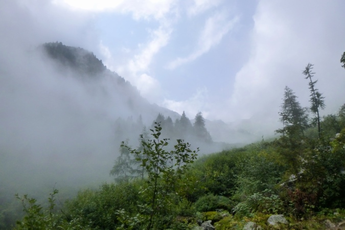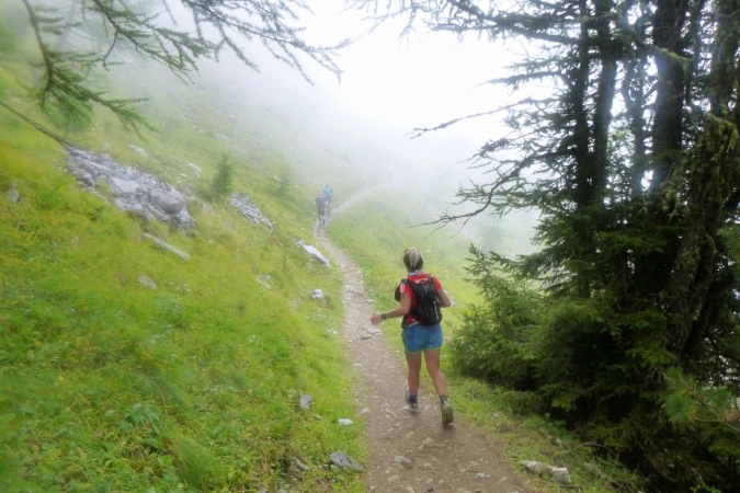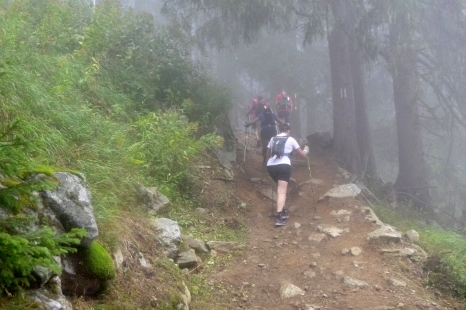 Mittlerweile ist es früh am Abend, aber noch hell genug für den finalen Anstieg nach Le Flegere. Mal wieder so 700 hm auf 3 km, aber gemächlich ansteigend, keine Quälerei. Steine, große und kleine, bilden Stufen, dazwischen ist oft genug glatter Waldboden. Richtig angenehm. Ernst wird es erst weiter oben. Die Steigung zieht an, dann ein Sessellift, auf blauer Piste dann zum Gipfel. Nebel zieht auf und bringt Kälte mit. 100 m Sichtweite und einstellig kalt. Man serviert uns heiße Suppe mit Nudeln. Das war so zwar nicht angekündigt, tut aber enorm gut. Hier kann man Schüssel und Besteck brauchen. Also, merket auf – nehmt hier ruhig mehr Zeugs mit, als vorgeschrieben.
