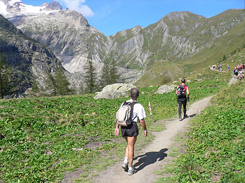 Wir sind oberhalb des Val Ferret und schauen auf die Südhänge des Mont-Blanc mit Dent du Geant (Zahn des Riesen) und Grand des Jorasses. Das Laufen in dieser grandiosen Landschaft und auf dem jetzt fast ebenen und sehr guten Weg ist das reinste Vergnügen. Ich bin restlos begeistert und könnte ohne Ende fotografieren. Herrlich blühende Blumen säumen den Weg, der von etlichen mehr oder minder breiten und tiefen Bächen gekreuzt wird. Manche der Almhütten sind verfallen, andere sind bewohnt, wie der Rauch aus den Kaminen verrät.
