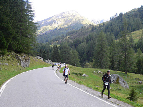 Wir erreichen Arnuva und werden dort von vielen Schaulustigen und Wanderern lautstark begrüßt. Die Verpflegung lässt keine Wünsche offen. Stärkung ist jetzt angebracht, auf den nächsten 4 Kilometern zum Grand Col Ferret, dem höchsten Punkt der gesamten Strecke, sind fast 800 Höhenmeter zu bewältigen.