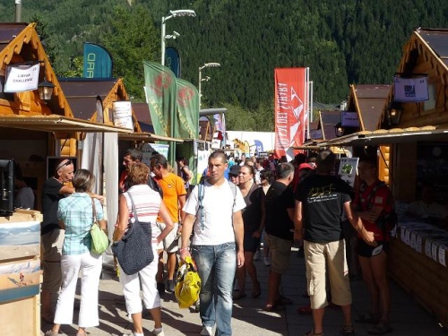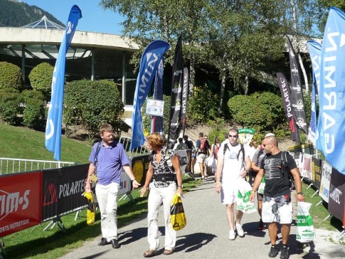 Vom Centre Sportif ist es, immer der durch Chamonix rauschenden Arve entlang, nicht weit zur Place du Mont-Blanc. Hier findet der „Salon d’Ultra Trail“, die Läufermesse in einem auf dem Platz errichteten Hüttendorf statt. Das Warenangebot, vor allem aus dem Trail- und Outdoorbereich, ist wahrlich beeindruckend: Ich entdecke lauter Dinge, von denen ich vorher noch gar nicht wusste, dass ich sie brauchen könnte. Ultralaufveranstalter aus aller Welt, von den ich teilweise noch nie etwas gehört habe, präsentieren ihre Veranstaltungen. Ich muss schon etwas suchen, bis ich die Hütte Nr. 83 finde, wo wir uns das UTMB-Teilnehmer-Shirt abholen dürfen.