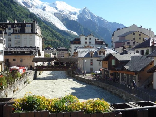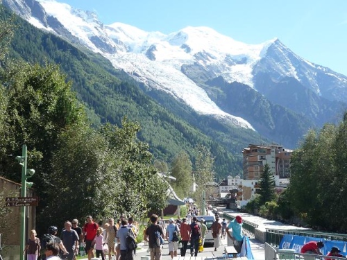 Gleich nebenan erreicht man die langgezogene Fußgängerzone der Stadt. Mit ihren alten Häusern hat sie viel Flair. Zwischen den sich dicht aneinander reihenden Lokalen und Geschäften wimmelt es nur so von Menschen. Omnipräsent ragt im Hintergrund vor dem azurblauen Himmel der in der Sonne weiß leuchtende Koloss des Mont Blanc-Massivs empor. Eine perfekte Kulisse. Es ist heiß - 30 Grad C im Schatten meldet ein Thermometer. Zum Glück muss ich nicht heute laufen. So ist es kein Wunder, dass in den Straßencafes kaum ein Platz zu bekommen ist. Und wohin ich auch schaue: die Läufer haben die Stadt erobert.