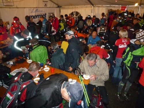 Unbeschadet und erleichtert erreiche ich nach 71,1 km um 2 Uhr nachts Trient (1.300 m üNN). Bei unserer Schleife durch den Ortskern ist es noch ruhig, aber im Festzelt erwartet mich einmal mehr ein Hexenkessel, was wohl auch daran liegt, dass so mancher der feiernden Zuschauer schon kräftig dem Alkohol zugesprochen hat. Wie in Champex ist auch hier das Zelt in einen für Läufer reservierten und einen für jedermann offenen Bereich aufgeteilt. Zum Glück ist der Andrang am Buffet nicht so heftig wie in Champex. Heiße Suppe, Tee und verdünntes Cola sind für mich auch hier wieder das Elexier zur Erweckung noch verborgener Energien, wenngleich ich mich längst nicht so geschwächt fühle wie beim Einlauf in Champex. Dennoch: Ich lasse mir Zeit, denn ich weiß: Auch der nächste Berg wird wieder eine harte Nuss.