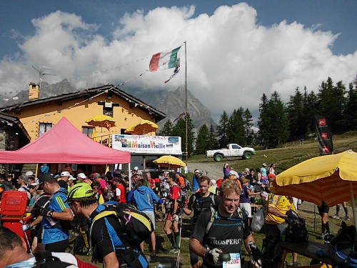Viele geben schon beim ersten Aufstieg mächtig Gas, ich lasse mir noch Zeit. Die Strecke ist schließlich lang genug um sich kaputt zu machen. Außerdem laufe ich hier kein Rennen gegen andere (das ohnehin nur einer gewinnen kann...), sondern für mich selbst. Um 10:20 Uhr komme ich am VP Col Checrouit an und habe schon eine Menge an Flüssigkeit verloren und tanke ordentlich nach.
