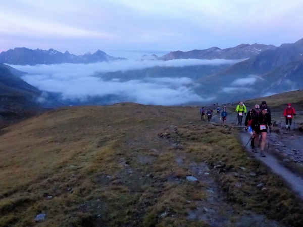 Immer wieder stürzen um mich herum Läufer, doch niemand scheint sich ernsthaft zu verletzen. Ich komme mit solchen Strecken recht gut zurecht. Feiner Sprühregen und dichter Nebel wandeln den Schein unserer Stirnlampen in eine diffuse Lichtwolke, in der man kaum den Boden vor den Füßen erkennen kann. Das hält auf! Meine Hoffnung, bereits bei Saint Gervais einen guten Abstand zum Zeitlimit zu haben, muss ich hier aufgeben. Etwa bei km 16 fragt mich eine sichtlich eingeschüchterte Japanerin, ob ich weiß, wie viele Kilometer wir schon geschafft haben. Soll ich ihr sagen,  nicht einmal 10 %?