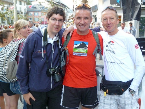 Beim Mittagessen erreicht mich die SMS, dass der Start auf 23.30 Uhr verschoben wird. Dabei wäre ich froh, ich könnte mich jetzt schon vom Acker machen. Die zusätzliche Zeit verbringe ich damit, dass ich den ankommenden Teilnehmern des TDS zujuble und dabei besonders auf Max warte. Der wirkt bei der Entgegennahme der Finisher-Weste noch sehr frisch, obwohl sein Lauf aus Wettergründen 10% länger als vorgesehen ausfiel.