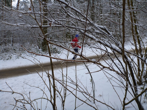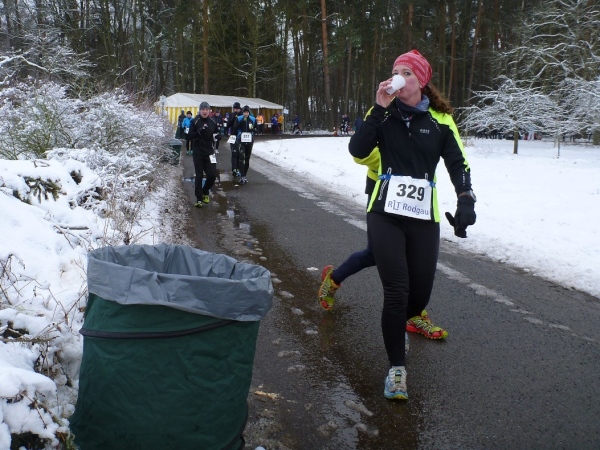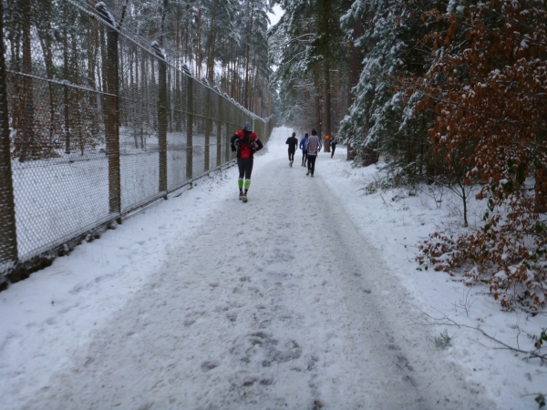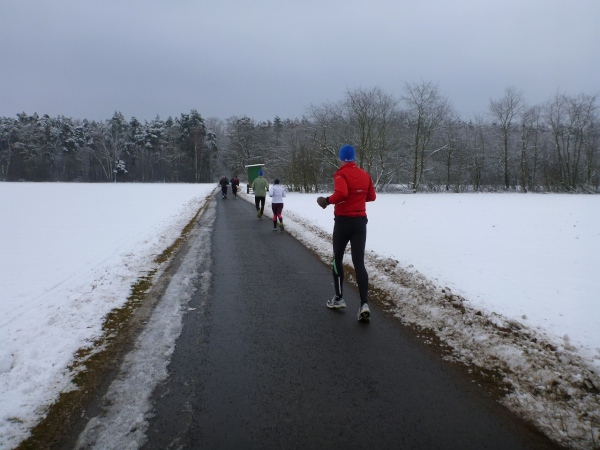 Ja, wenn es auf dem Laufkurs an den Stellen im Bereich des Wendepunkts, zwischen beiden Wäldern und am Opelgelände nicht immer tiefer werden würde. Gerade am Wendepunkt kratzen die Helfer den lockeren Schnee weg, werfen Splitt drüber und fangen nach zehn umgekehrten Läufern wieder von vorne mit dem Scharren an.