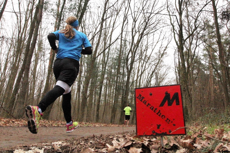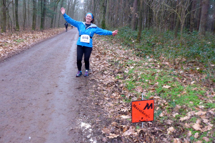 Dann beginnt es doch zu regnen. Der Wind wird unangenehm kalt. Bei Konjit sind nun die Beine schwer, sie muss abreißen lassen. Jeder wieder für sich, kämpfen wir uns gegen den Wind und durch den Regen. Im Wald ist es deutlich angenehmer. Dann kommt meine liebste Runde, die 9. An der VP laufe ich auf Petra auf. Wir kennen uns von früher. Sie verrät mir, dass dies heute ihr 50. Marathon ist. Gleich wird sie ihn geschafft haben. Am Marathonschild halten wir dieses Ereignis in einem Foto fest. Neu motiviert, läuft sie mir nun auf und davon.