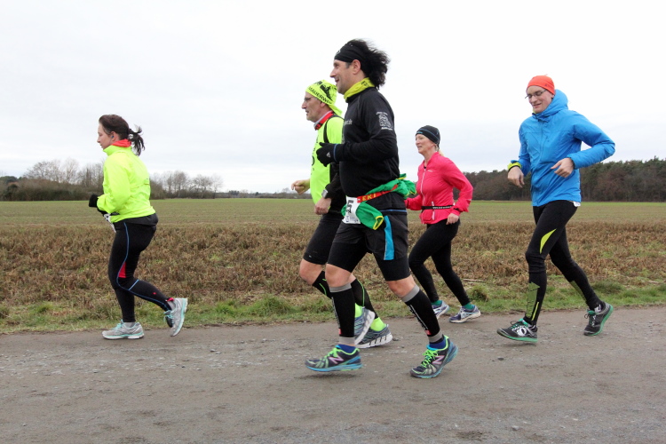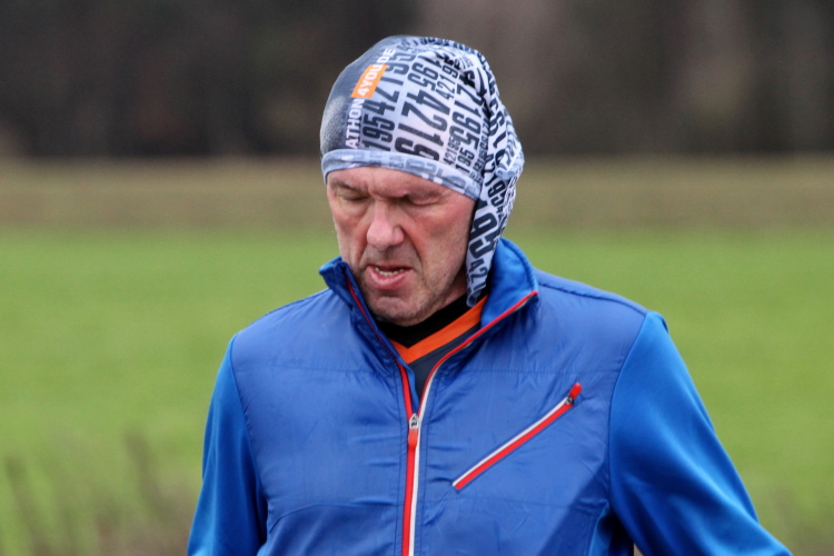 Mit 8 °C sind die Temperaturen heute ganz angenehm. Der Wetterbericht verspricht allerdings ab Mittag ausdauernden Regen. Die Wolken hängen tief; das sieht nicht gut aus. Ein unangenehm böiger Wind fegt über die Felder. Nach der VP kommt er von hinten, hinter der nächsten Kurve von der Seite und ab km 3 dann von vorne. Es gelingt mir, in den ersten Runden einen geeigneten Windschatten zu finden. So geht es ganz gut.