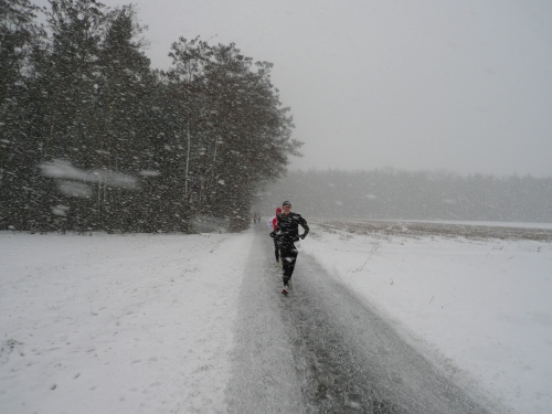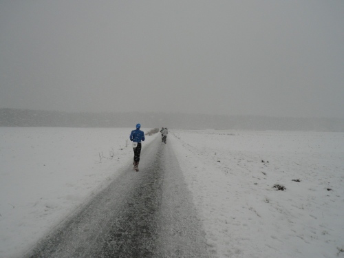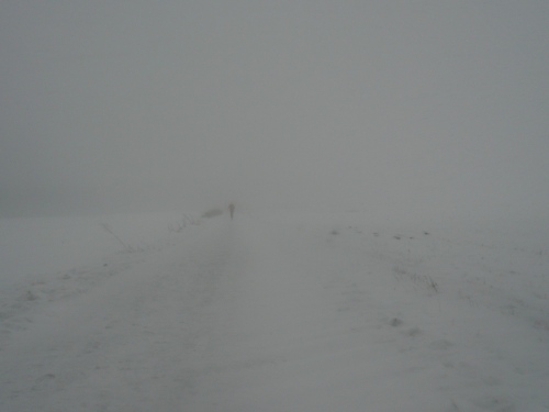 40 Minuten für die letzte Runde- Mein Leben versinkt im Blizzard. Der Wind pfeifft über das Feld mit einem grellen Ton und bedeckt mit grausig-weissen Schlieren die Fußspuren meiner Vorläufer. Der Schnee klatscht mir gegen das Ohr. Junge, Junge, ist das kalt!. Ich wehre den Schnee mit der Hand ab, es ist wie vor 2 Wochen. Weit und breit ist niemand in diesem weissen Getöse zu sehen, nicht mal die Silouette des rettenden Waldrandes ist zu erkennen. Meine rechte Hand ist aufgeplatz und blutet wie Sau, was für ein Leiden muss das wieder sein?