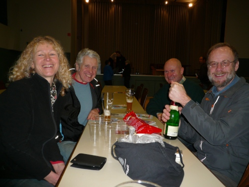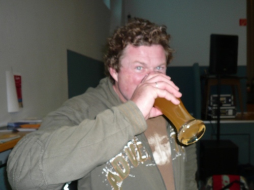 Nach der nächsten Runde sehe ich Eric (E.T.) im Zielbereich. Er versucht für die nächsten Runden Motivation durch den Konsum von Weizenbier zu erlangen. Ich nehme ihm ein bißchen Konsum ab, doch der Glühwein von Gabi war besser.
