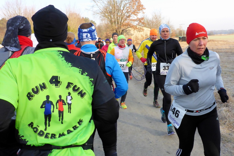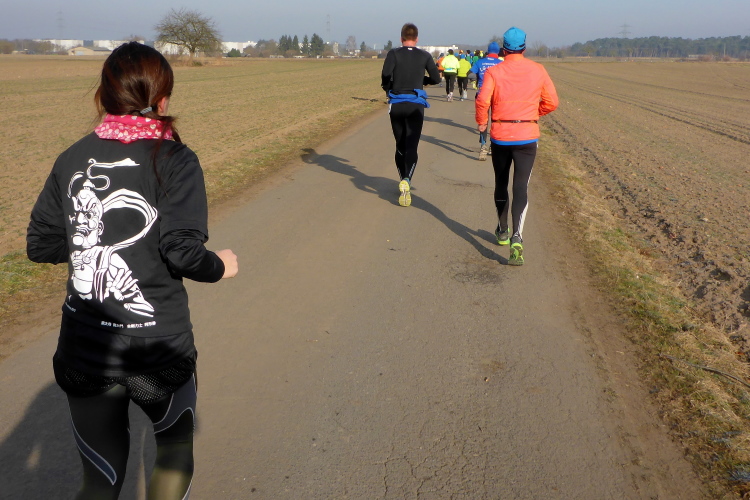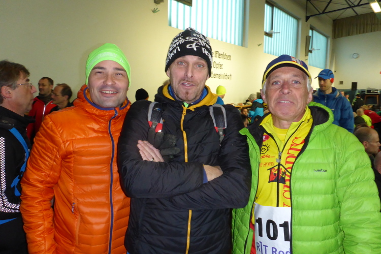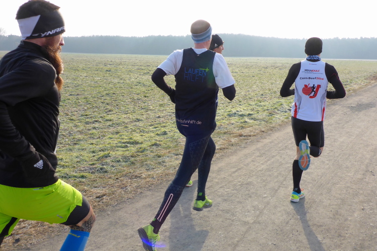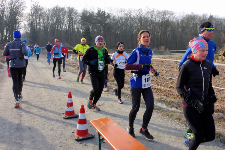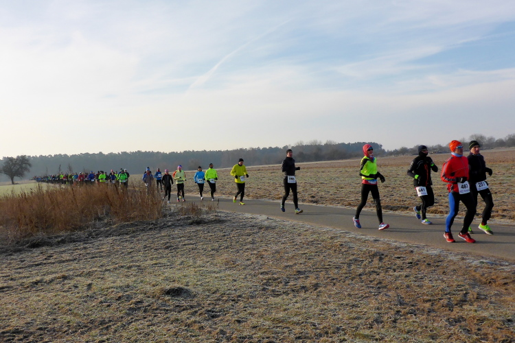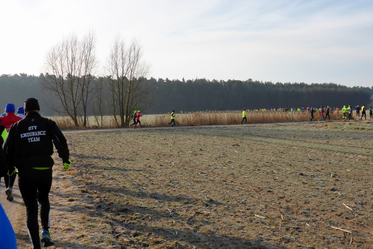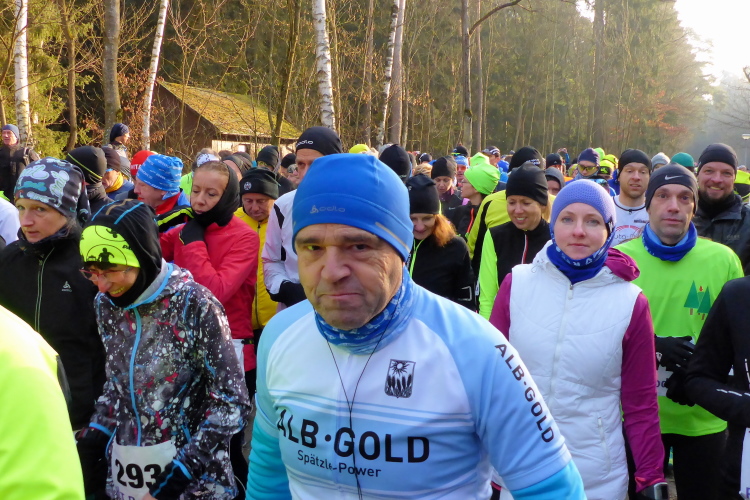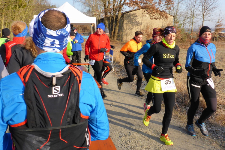 Die Gämsbrüh sieht zugefroren aus. Doch seit Wochen hat es keinen Niederschlag gegeben, was aussieht wie Eis, ist gefrorener Schmodder. Wir haben minus 6 Grad und einen grandiosen Sonnenlauf vor uns. 812 Starter fetzen los, es ist so trocken, dass eine mächtige Staubwolke über dem Läuferfeld hängt. 10 Meter hinter dem Start stehen Dixiklos, bei zwei Läuferinnen setzt augenblicklich der Pawlow´sche Effekt ein.