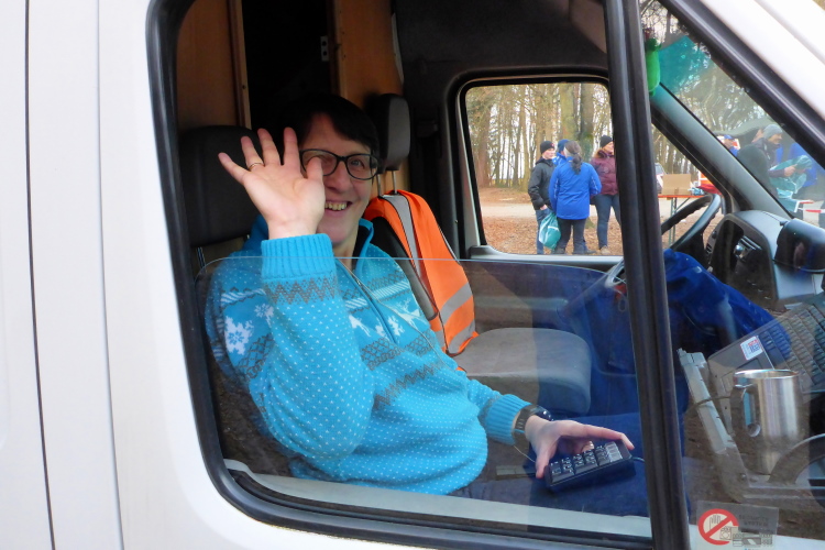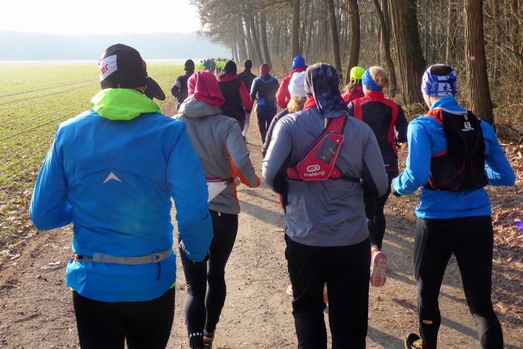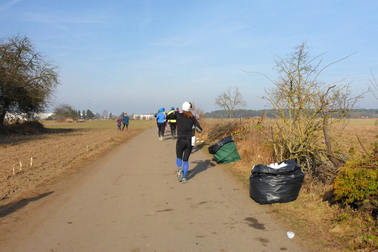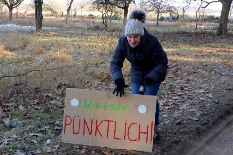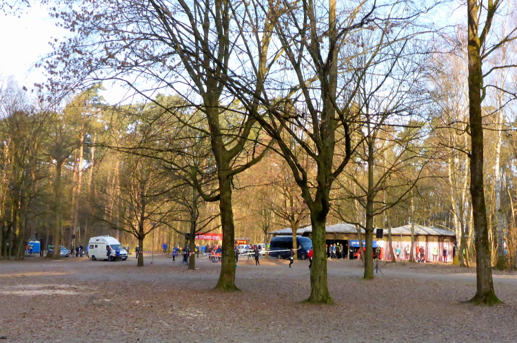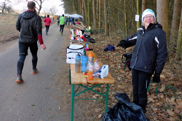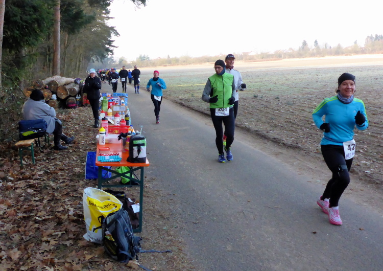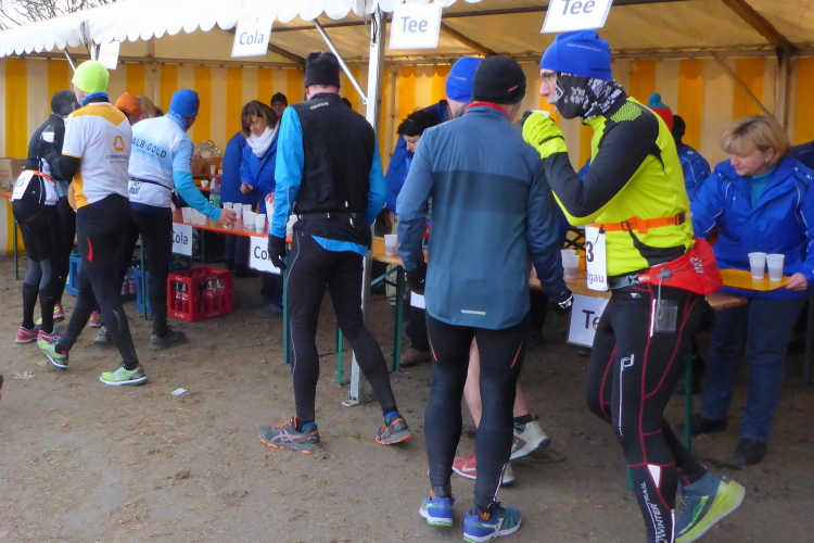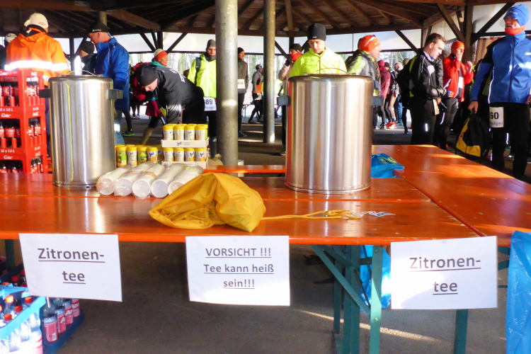 Friedensschutz besteht auch für die Eigenverpflegung, die auf Tischen aufgebaut wird. Eigentlich bietet die reguläre Verpflegungsstelle alles, was der Läufer braucht. Ich habe trotzdem noch am Bahnhof Ersatz-Eigenverpflegung erstanden, deponiere diese strategisch günstig am Ende der Tische. Dann geht’s durch das kleine Wäldchen zum Start.
