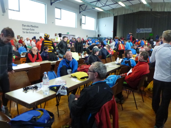 Jetzt geht besser. Die Beine haben wieder Kraft. Locker kann ich die letzte Runde zu Ende laufen. Danke an die Helfer die bereits mit dem Säubern der Strecke beschäftigt sind, danke an die, die uns immer noch am Wendepunkt anfeuern, danke an die, die mit ihrer orginellen Musikauswahl mitten im Wald unsere letzten Kräfte mobilisieren. Im Ziel werden wärmende Folien verteilt. Ich stärke mich ausgiebig an der Zielverpflegung. Zusammen mit den anderen Finishern mache ich mich auf den Weg zur Halle. Dort ist noch mächtig Betrieb. Gerade werden die Sieger der DUV-Cups geehrt, dann folgt die Siegerehrung für den Ultramarathon. Von 835 Startern sind 587 ins Ziel gekommen. Ein neuer Rekord.