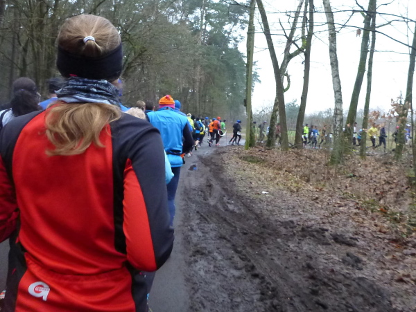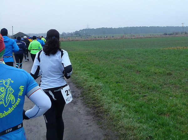 Zunächst geht es gerade aus und leicht bergab. Eine scharfe Rechtskurve bringt uns an den Waldrand. Hier laufen wir erst einmal entlang. Nach ca. 800 m kommen die Tische mit der Verpflegung. Noch haben die Helfer nichts anderes zu tun, als uns anzufeuern. Es geht auf das freie Feld. In der Ferne können wir die bunten Shirts der Führenden sehen. Nach ca. 300m und dem scharfen Abzweig, wieder rechts, laufen wir Richtung Wald. Im Wald passieren wir das km 2 Schild und kurze Zeit später das Schild, das die erfolgreiche Marathondistanz anzeigt. Das ist aber erst in der 9. Runde relevant. Oh je, hier gibt es Pfützen. Ich habe Glück und laufe zufällig einen Kurs, der die matschigen Stellen umgeht. Bei den vielen Beinen ist ein Ausweichversuch nicht anzuraten.