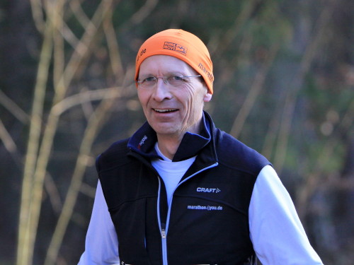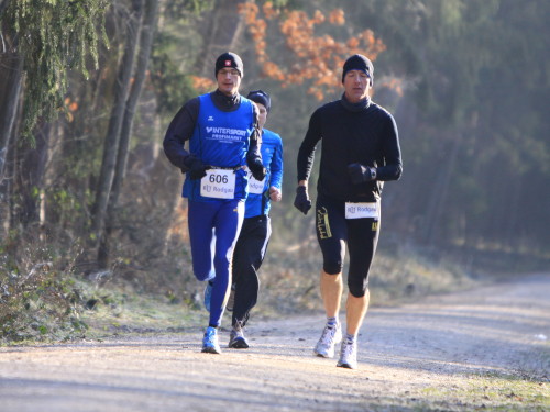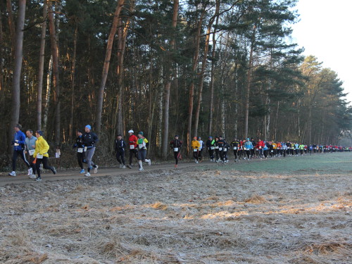 Unser Rundkurs, ganz grob ein Rechteck mit zwei Zacken beschreibend, lässt sich kurz und prägnant wie folgt charakterisieren: Wald, Feld, Wald, Feld, Wald. Dann ist die Runde beendet und dieser Rhythmus setzt sich in jeder weiteren Runde fort. Bei 10 Runden kommen da, wenn ich richtig gerechnet habe, 21 Wald- und 20 Feldpassagen zusammen – das hört sich schon beeindruckender an. Etwa zwei Kilometer einer Runde sind asphaltiert, der Rest führt entlang gut ausgebauter, vom Veranstalter zusätzlich präparierter Wirtschaftswege. Meine Trailschuhe sind da völlig überflüssig, zumal im Gegensatz zum Vorjahr alles schnee- und eisfrei ist.